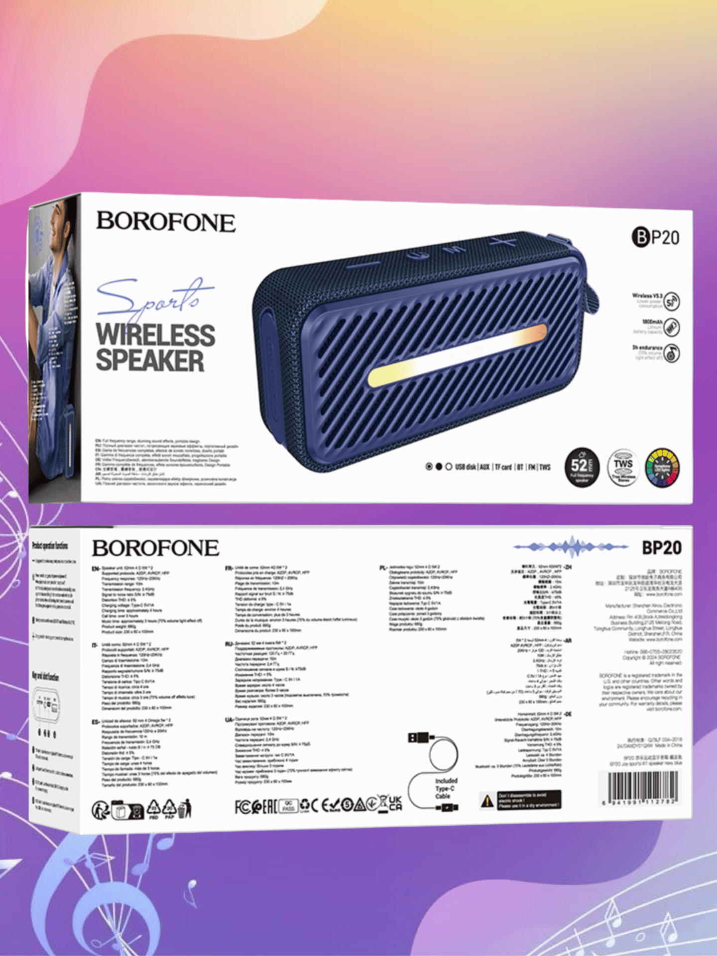 Беспроводная колонка Borofone BP20 — компактное и функциональное аудиоустройство, сочетающее современный дизайн и широкие возможности подключения. Модель оснащена чипом Bluetooth 5.3 (JL AC6965), обеспечивающим стабильное и энергоэффективное беспроводное соединение с источниками звука.