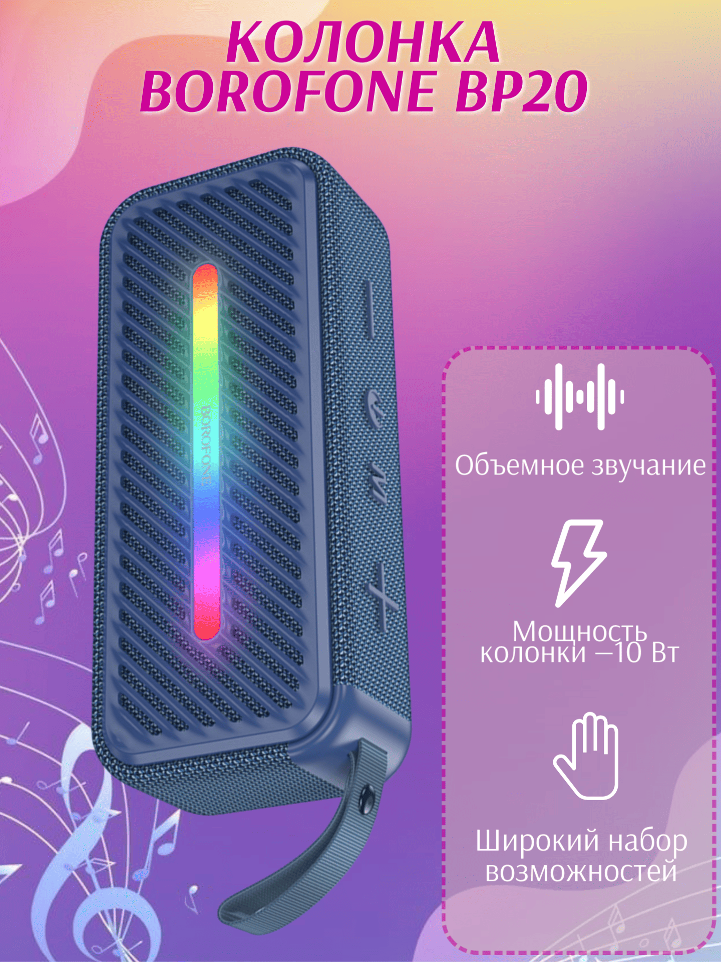Беспроводная колонка Borofone BP20 — компактное и функциональное аудиоустройство, сочетающее современный дизайн и широкие возможности подключения.