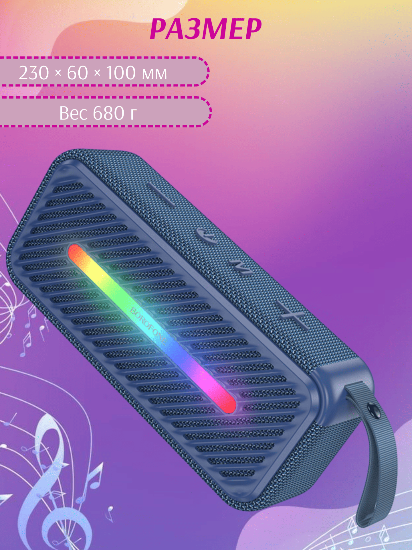 Компактные габариты (230 × 60 × 100 мм) и вес 680 г обеспечивают удобство переноски. Внешний вид дополняет стильная RGB‑подсветка, создающая эффектную атмосферу в вечернее время. Большие кнопки управления на корпусе делают эксплуатацию простой и интуитивно понятной, а предусмотренный ремешок позволяет легко брать колонку с собой в дорогу.