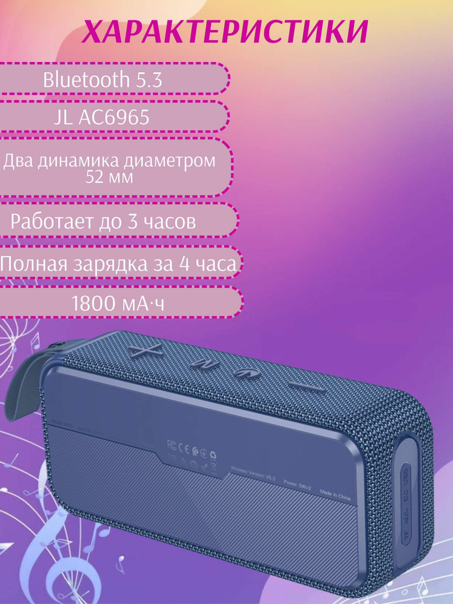 Колонка выдаёт насыщенный и сбалансированный звук благодаря двум динамикам диаметром 52 мм с суммарной мощностью 10 Вт (5 Вт × 2). Ёмкость встроенного аккумулятора составляет 1800 мА·ч: полного заряда хватает на 3 часа воспроизведения (при громкости около 70 % и отключённой подсветке), а для восполнения энергии потребуется примерно 4 часа.