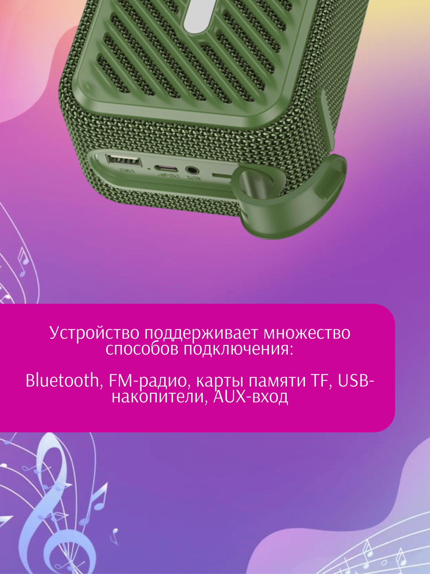 Устройство поддерживает множество способов подключения и воспроизведения: Bluetooth, FM‑радио, карты TF, USB‑накопители, вход AUX, а также режим TWS (спарчивание двух колонок для стереозвучания). Это делает колонку универсальной — она подойдёт для дома, поездок и вечеринок, позволяя слушать музыку с разных источников.