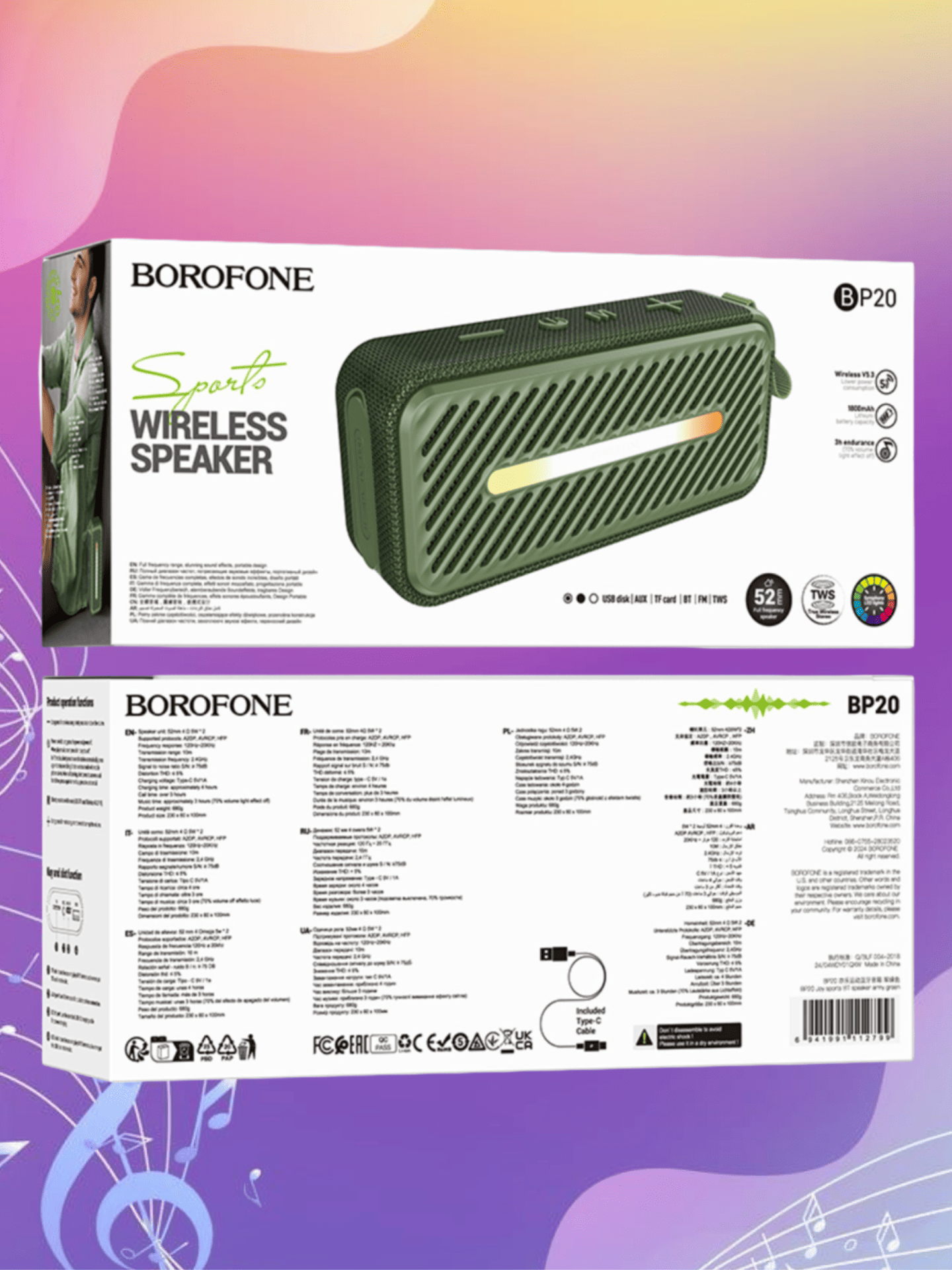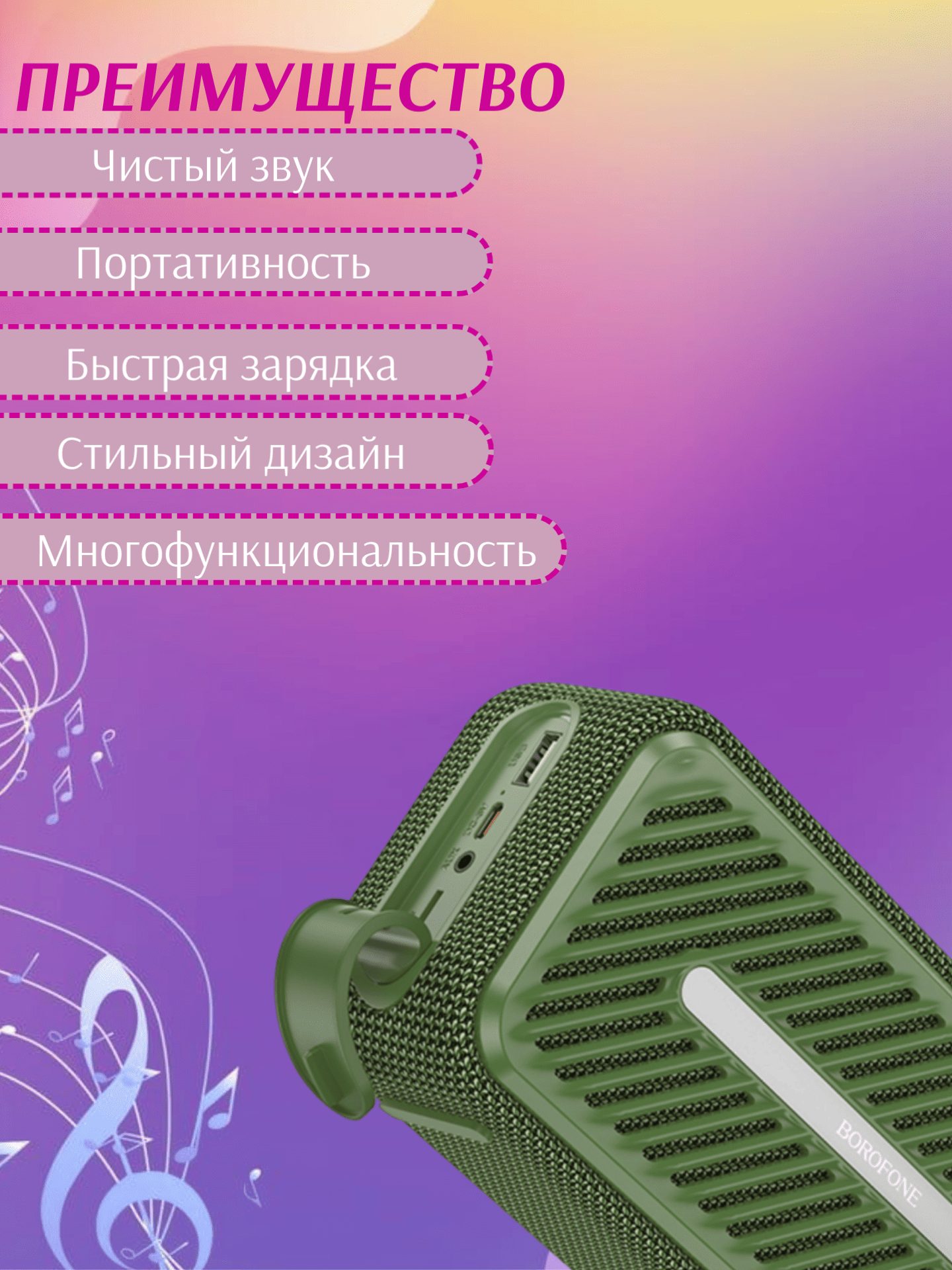 Беспроводная колонка Borofone BP20 — компактное и функциональное аудиоустройство, сочетающее современный дизайн и широкие возможности подключения. Модель оснащена чипом Bluetooth 5.3 (JL AC6965), обеспечивающим стабильное и энергоэффективное беспроводное соединение с источниками звука.