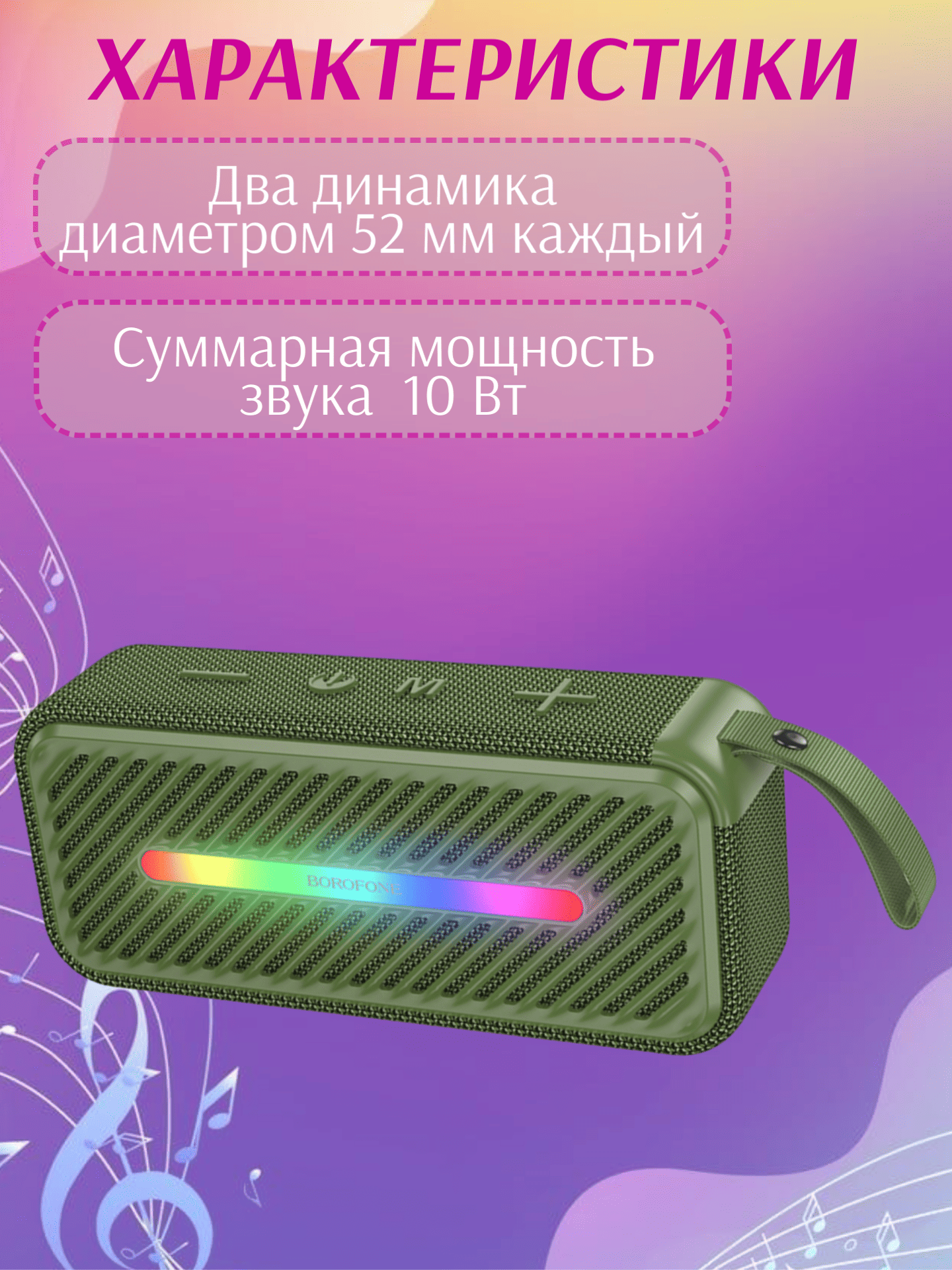 Колонка выдаёт насыщенный и сбалансированный звук благодаря двум динамикам диаметром 52 мм с суммарной мощностью 10 Вт (5 Вт × 2). Ёмкость встроенного аккумулятора составляет 1800 мА·ч: полного заряда хватает на 3 часа воспроизведения (при громкости около 70 % и отключённой подсветке), а для восполнения энергии потребуется примерно 4 часа.