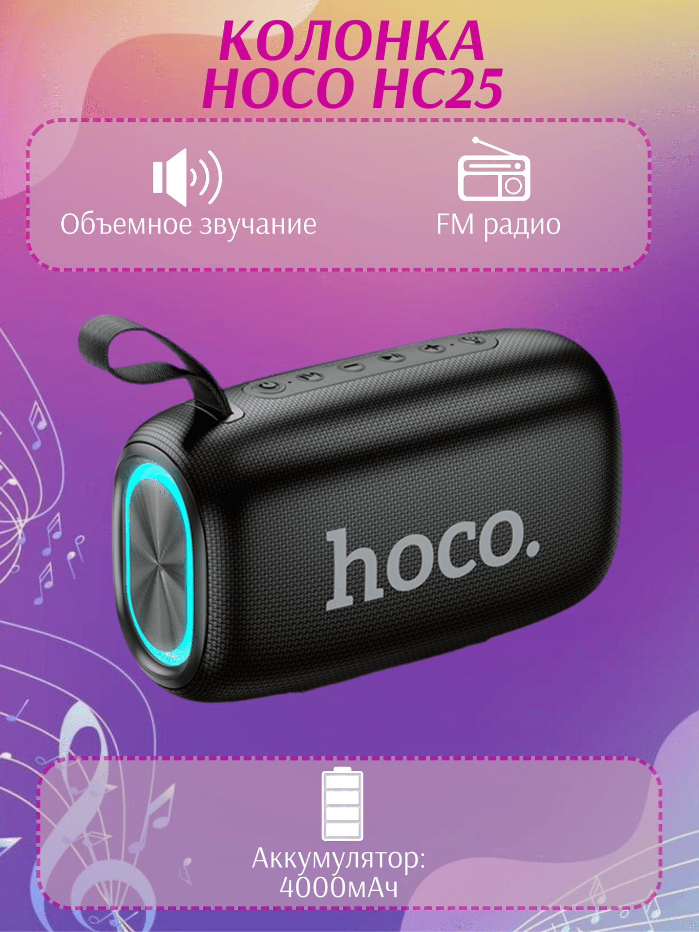HOCO HC25 обеспечивает громкое и чистое звучание с выразительными басами и комфортной передачей голоса. Подключение по Bluetooth позволяет быстро соединять колонку со смартфоном, планшетом, ноутбуком и другими совместимыми устройствами. Благодаря автономной работе вы можете слушать музыку без постоянной привязки к розетке.