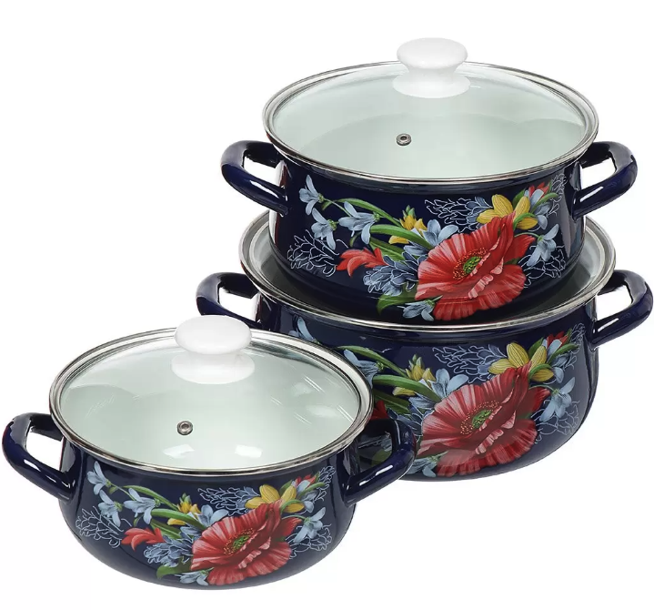 Состав набора: кастрюля с крышкой 2 л, кастрюля с крышкой 3 л, кастрюля с крышкой 4 л.