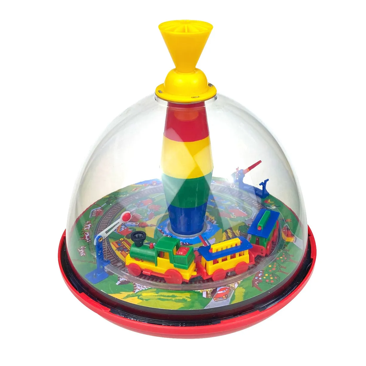 Юла работает на гироскопическом принципе, очень устойчива во время движения и выполнена из качественного яркого пластика. Раскрутите юлу-и вот поезд побежал.При раскручивании юла издает гудящий звук, напоминающий звук бегущего поезда.