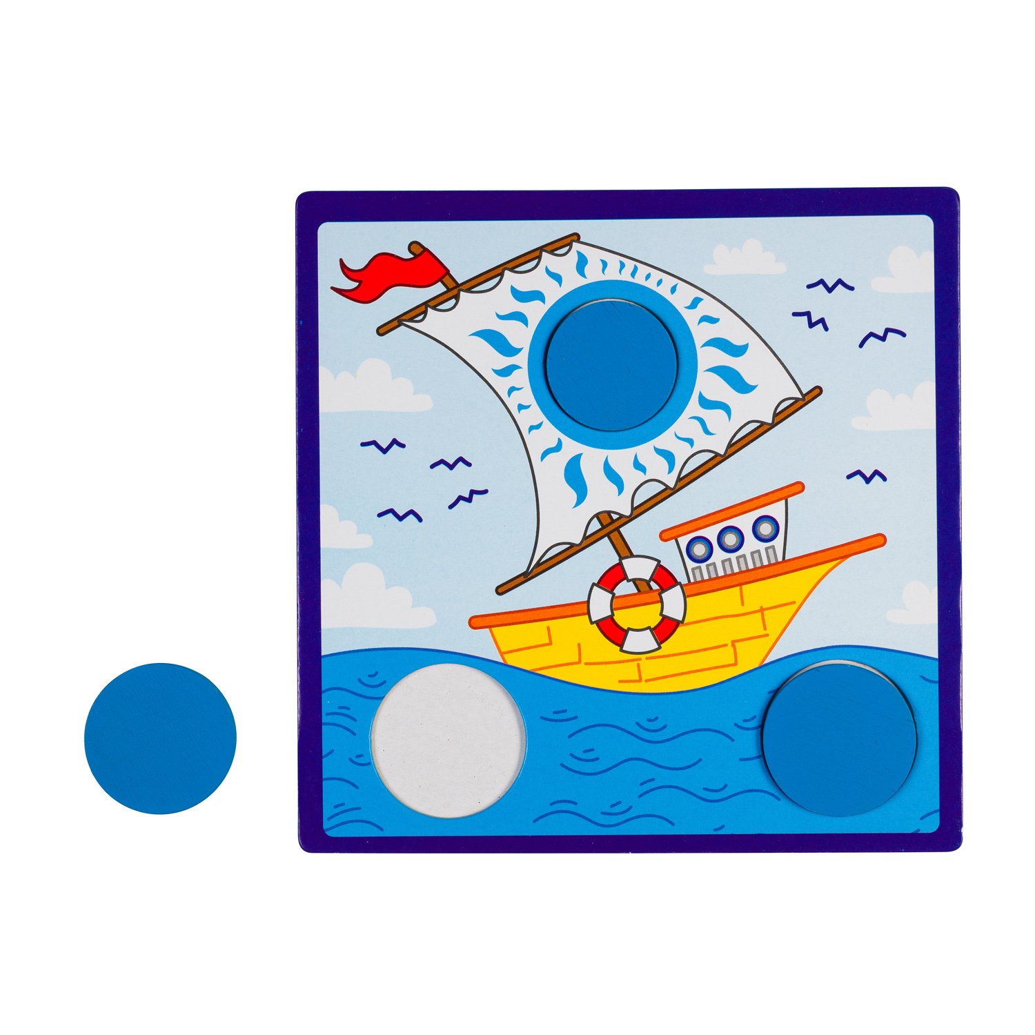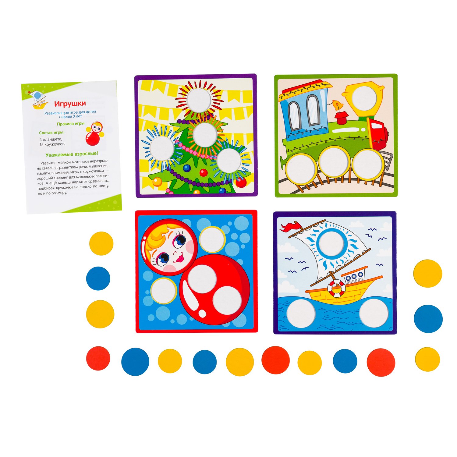 Игра из дерева «Игрушки» — увлекательная головоломка. Она состоит из небольших картонных планшетов, картинки на которых нужно дополнить деревянными кружочками.