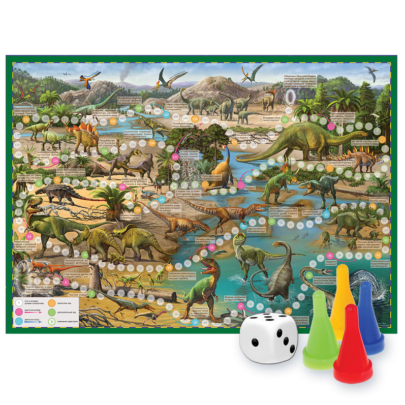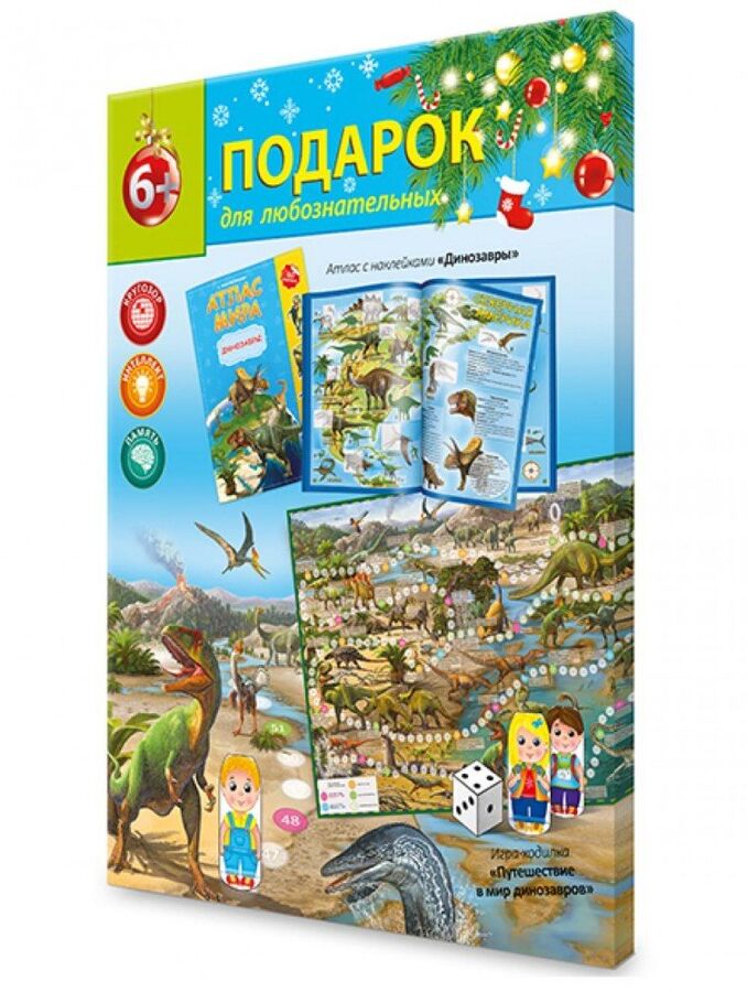Развивающий набор «Динозавры» из серии «Подарок для любознательных» включает в себя красочный атлас с 70 наклейками и игру-ходилку, которые объединены одной тематикой и направлены на изучение интересных фактов и знаний о мире.