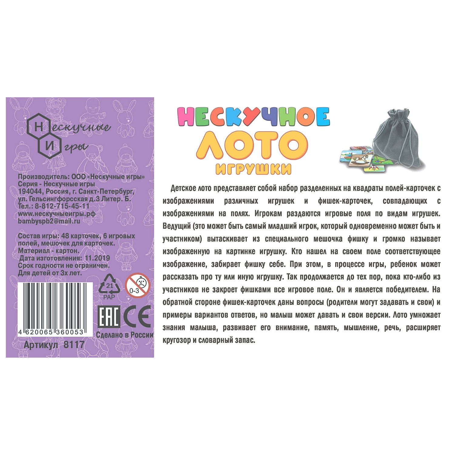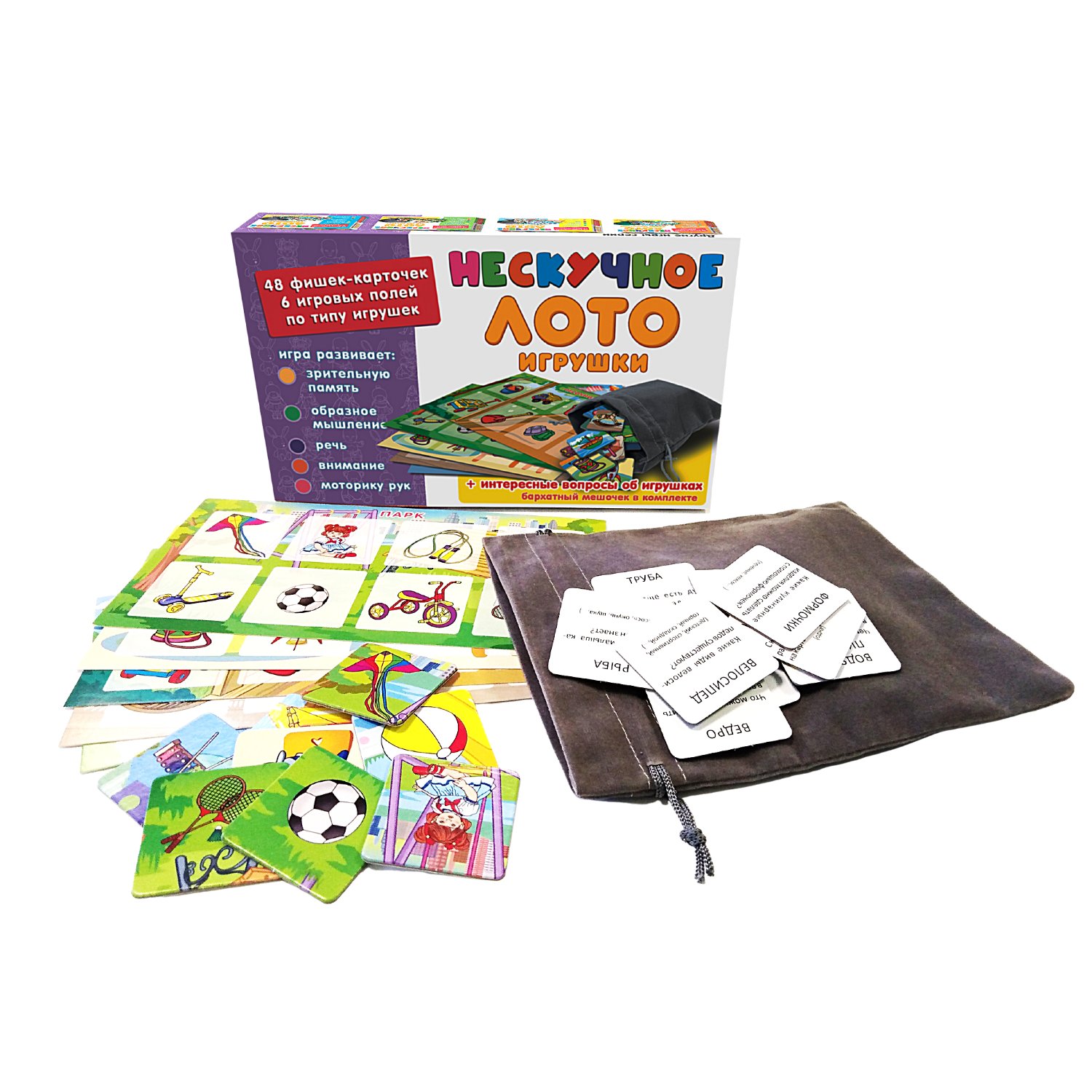 Игрокам раздаются игровые поля по видам игрушек. Ведущий (это может быть самый младший игрок, который одновременно может быть и участником) вытаскивает из специального мешочка фишку и громко называет изображенную на картинке игрушку. Кто нашел на своем поле соответствующее изображение, забирает фишку себе. При этом, в процессе игры, ребенок может рассказать про ту или иную игрушку. Так продолжается до тех пор, пока кто-либо из участников не закроет фишками все игровое поле. Он и является победителем. На обратной стороне фишек-карточек даны вопросы (родители могут задавать и свои) и примеры вариантов ответов, но малыш может давать и свои версии. Лото умножает знания малыша, развивает его внимание, память, мышление, речь, расширяет кругозор и словарный запас.