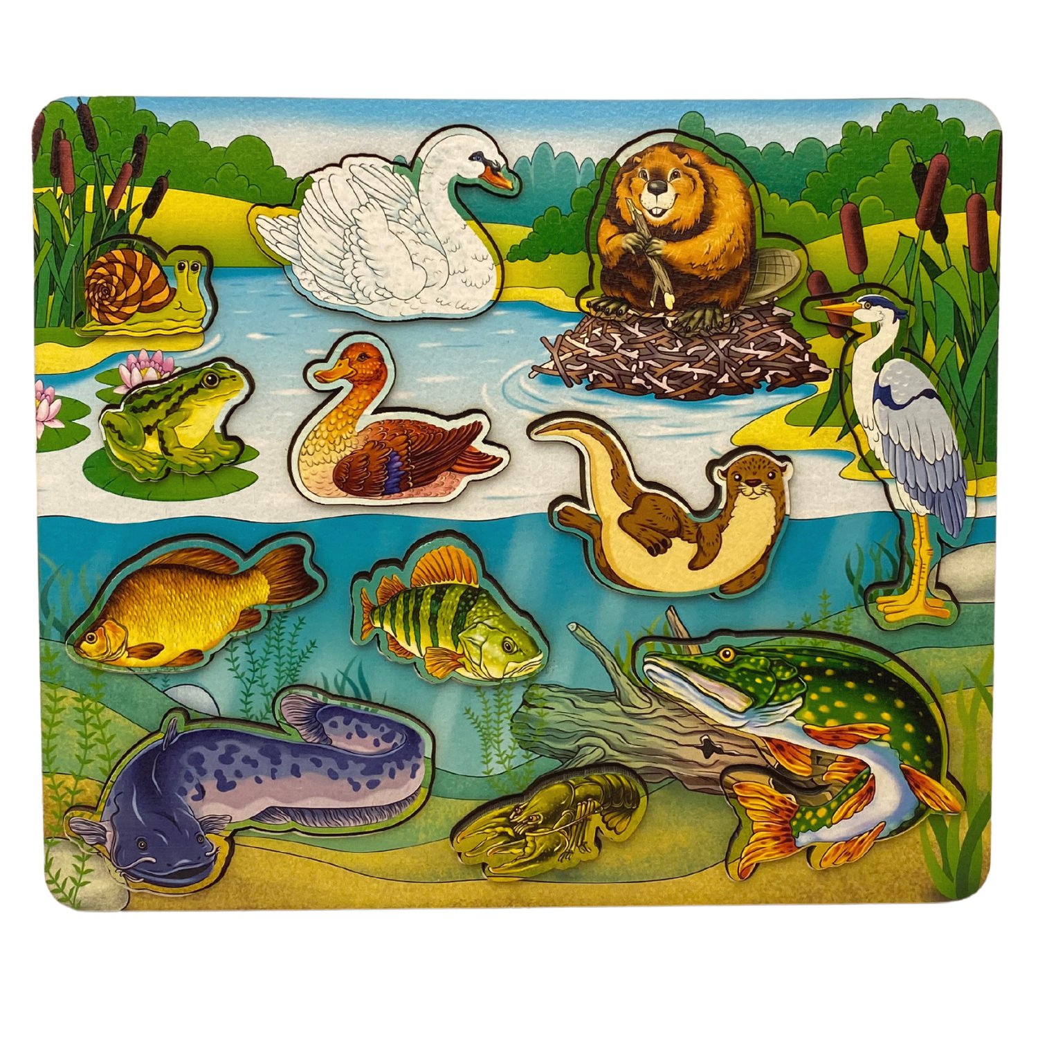Деревянная доска "Кто живет в пруду?" - это игровая панель для развития мелкой моторики, логики, внимания, усидчивости и воображения вашего малыша.