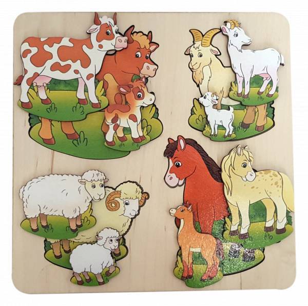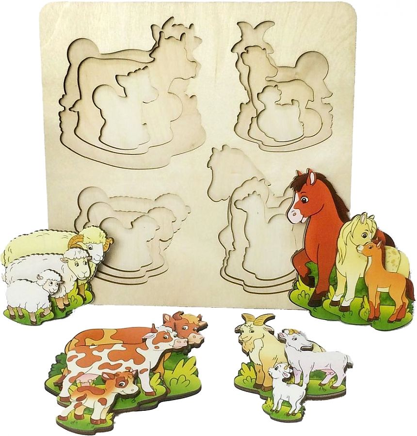 С помощью такой игры можно познакомить ребенка с домашними животными. Изучить понятия больше-меньше. Научить группировать фигурки одного вида. Выучить названия детенышей.