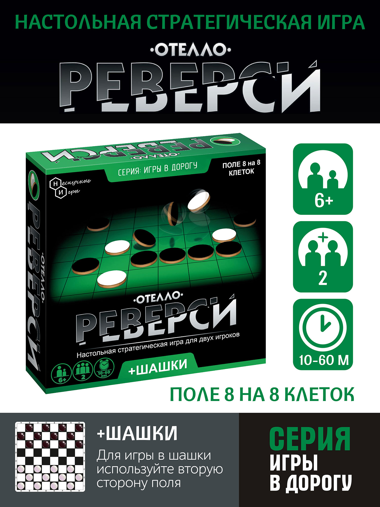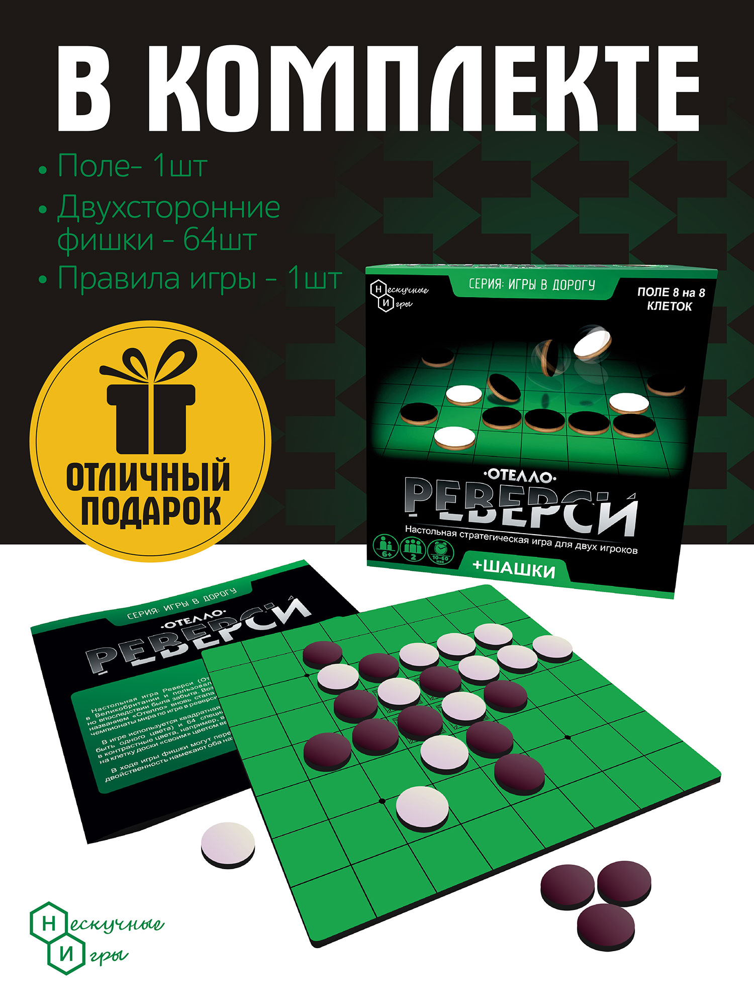 Стратегических решений может быть несколько, а сама игра отлично развивает логическое мышление. Благодаря двухстороннему полю, этот набор можно использовать для игры в шашки. Игра “Реверси” была придумана в конце XlX века в Англии, но и в наше время она не потеряла своей актуальности. Сейчас игра популярна среди интеллектуалов и любителей стратегических головоломок. По своей механике схожа с классическими шахматами, она также требует от игроков хорошей памяти, острого ума и логического мышления.