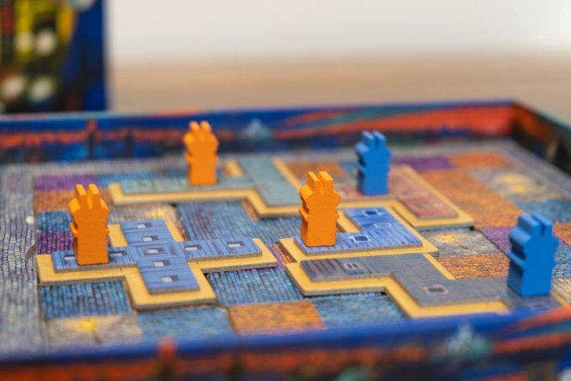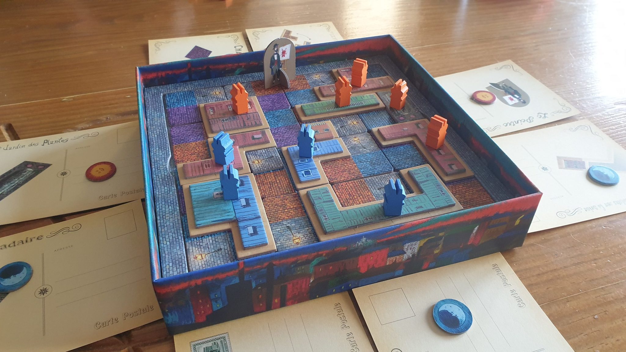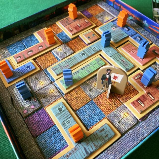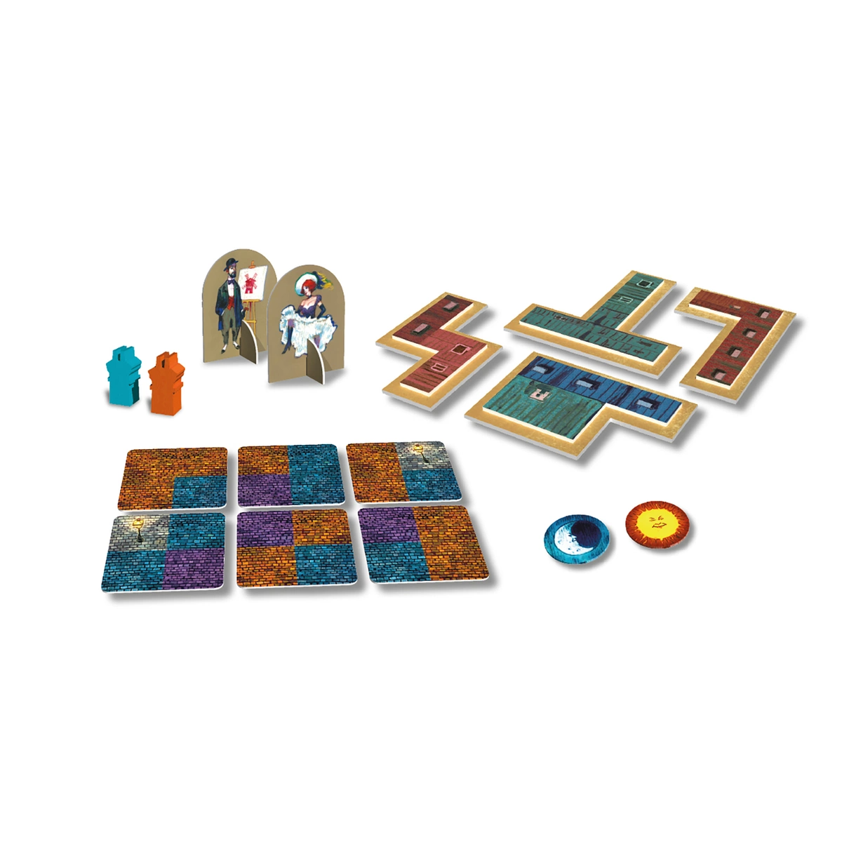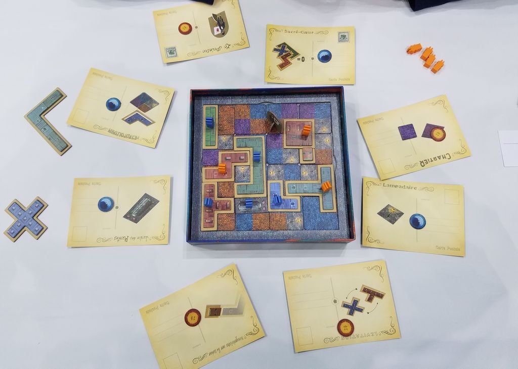 В первом этапе настольной игры «Париж: Город огней» игроки выкладывают тайлы мостовой, размечая территорию под будущее строительство. На тайлах три вида мостовой (по одному цвету для каждого игрока и общего цвета) и фонари, которые будут оправдывать название игры и приносить игрокам победные очки.