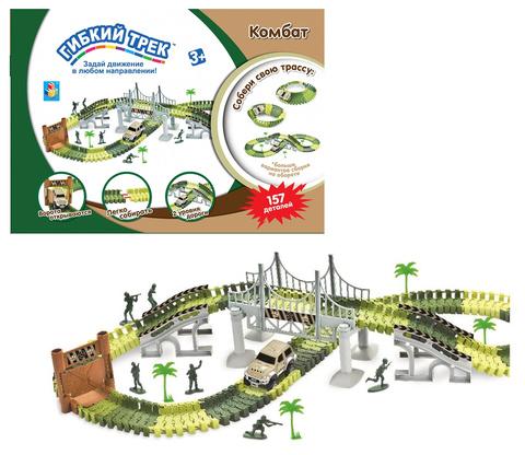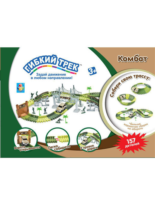 В игровом наборе "Комбат" ребенок найдет детали для сборки гибкого трека, машинку, фигурки солдатиков, ворота и многое другое. Мальчики с удовольствием соберут трек, по которому будут пускать автомобиль. Трек можно собирать в нескольких вариантах, примеры указаны на упаковке.