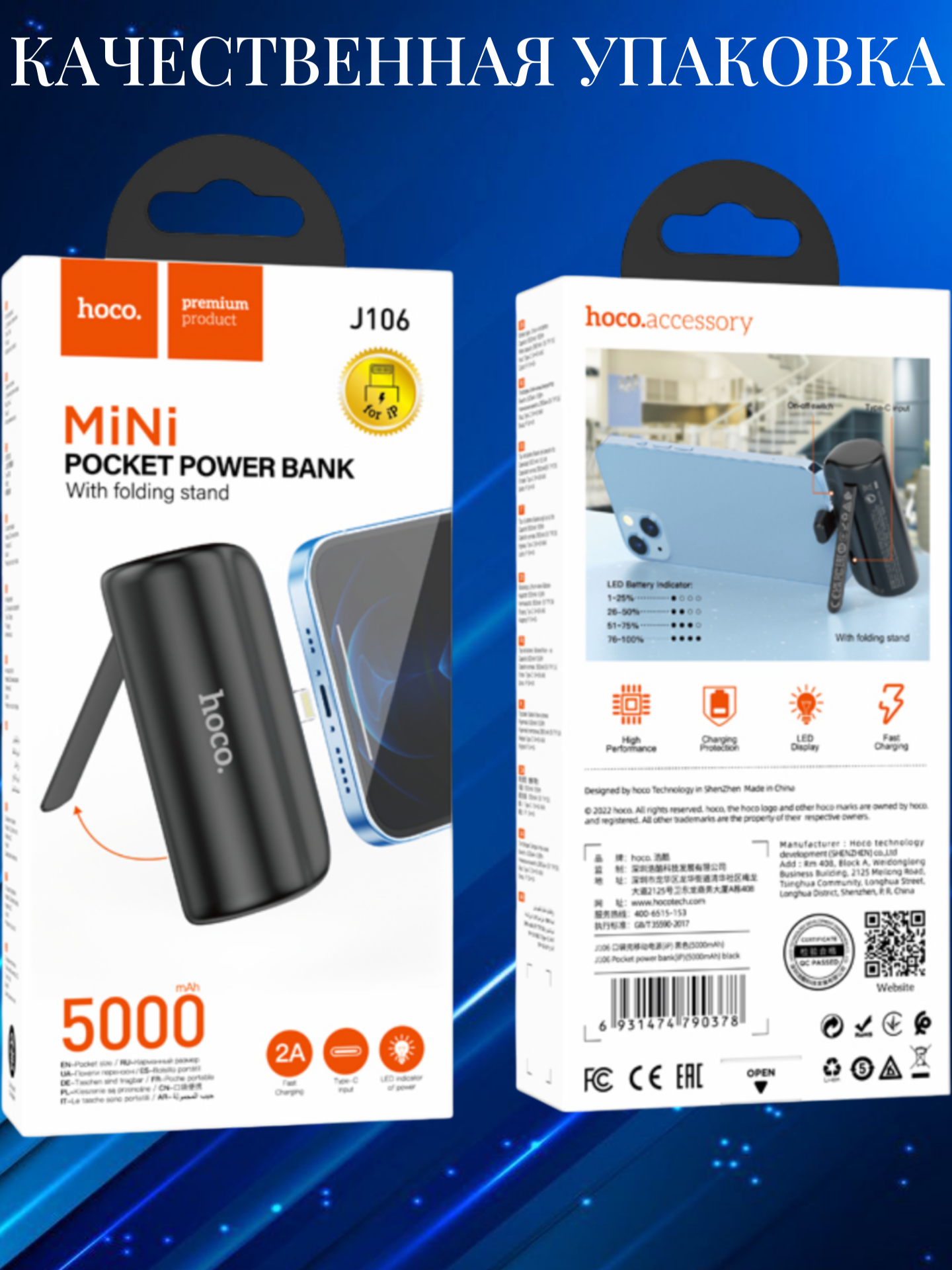 Внешний аккумулятор Hoco J106 — это компактное и стильное устройство черного цвета с емкостью 5000 мАч. Он оснащен встроенным кабелем Lightning, что делает его удобным для зарядки устройств. Аккумулятор выполнен из огнестойкого материала ABS + PC, что обеспечивает его долговечность и безопасность.