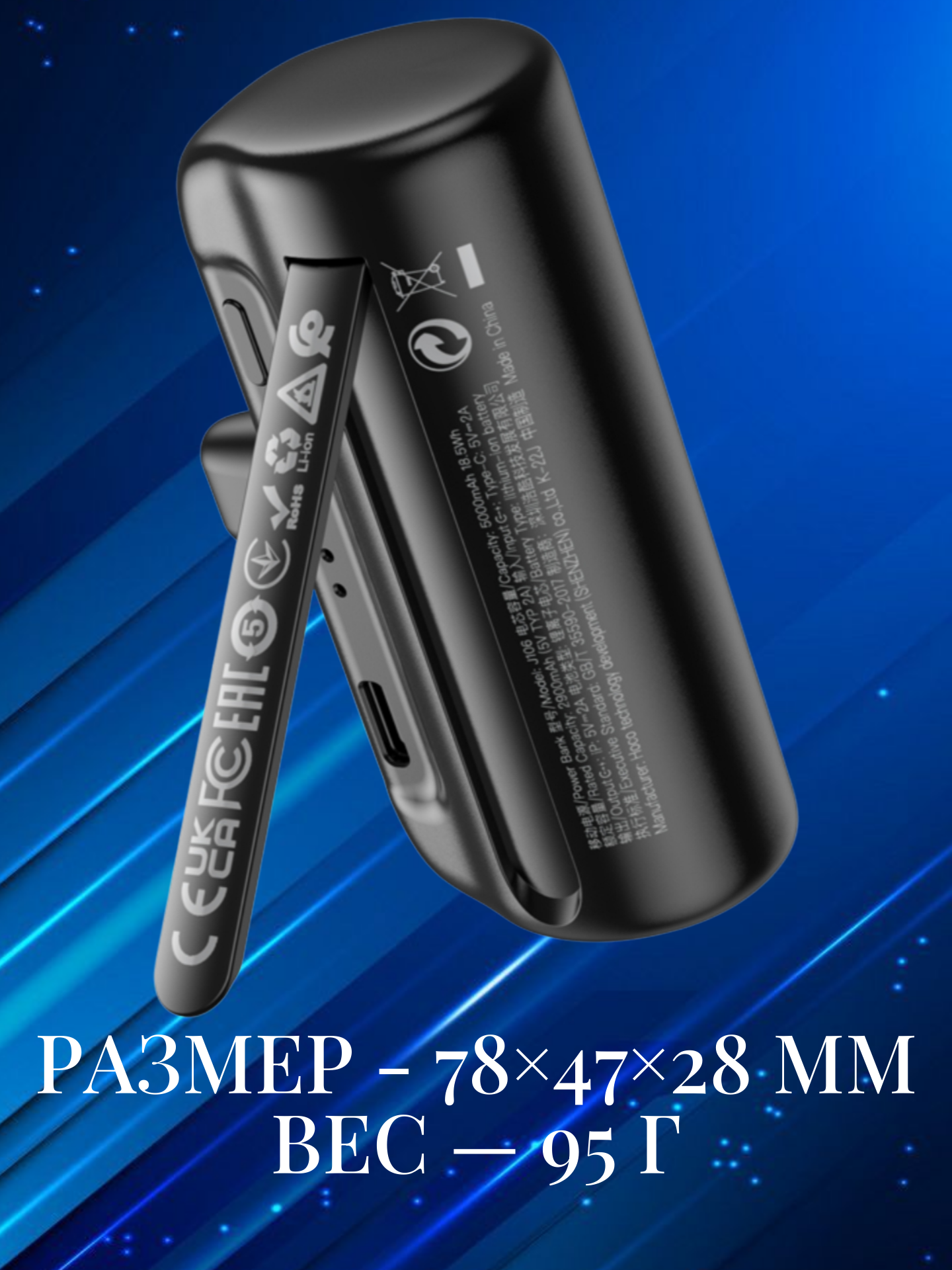 Устройство поддерживает вход через разъем Type-C с мощностью 5V/2A и выход через Lightning с той же мощностью. Оно оснащено LED-индикатором, который показывает уровень заряда. Размеры аккумулятора составляют 78×47×28 мм, а вес — всего 95 г, что делает его легким и удобным для переноски.