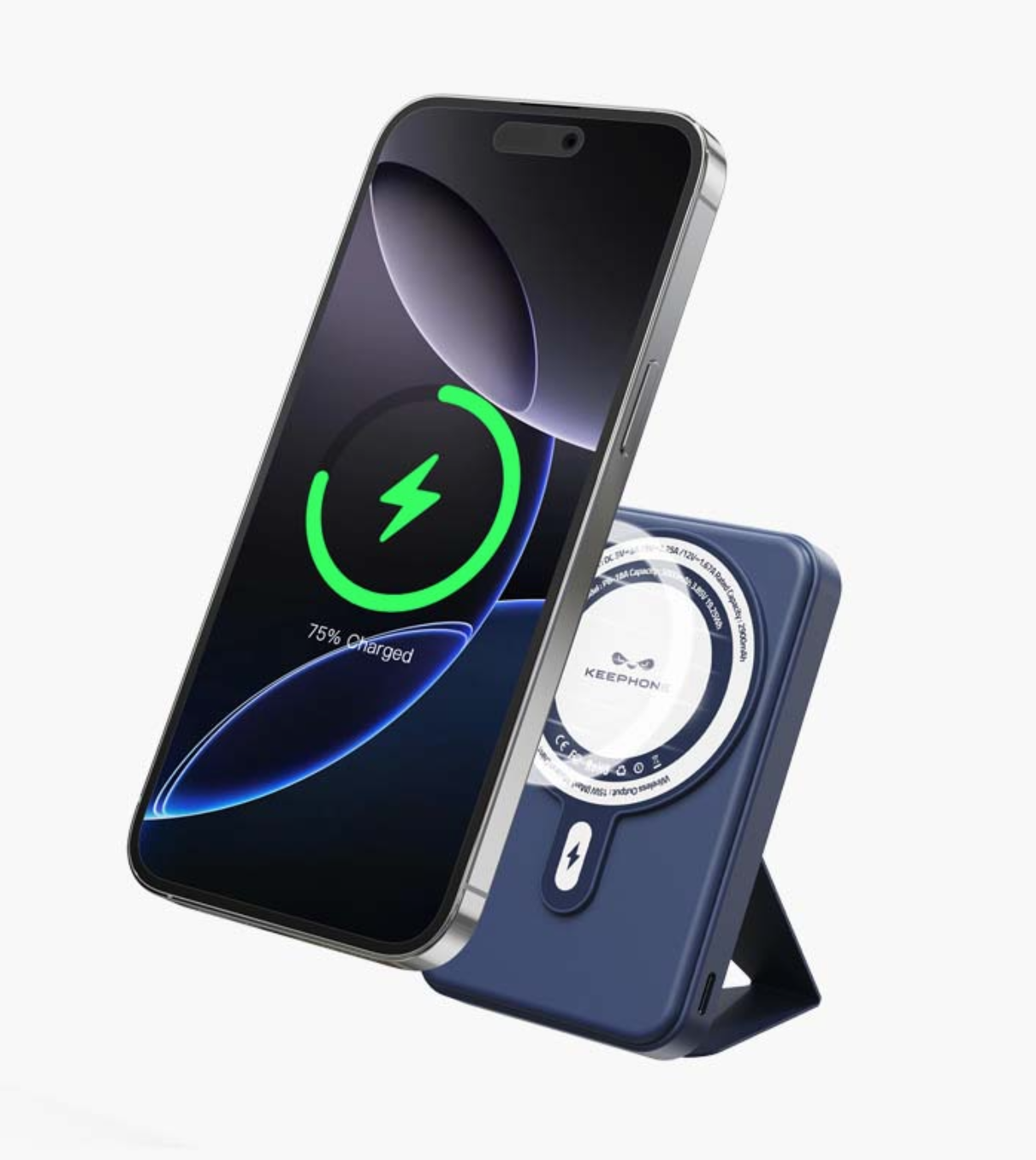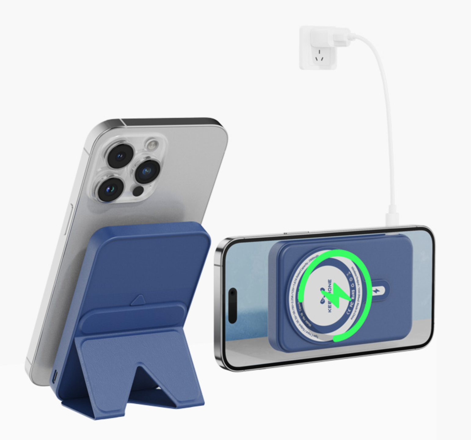 Беспроводная зарядка работает на мощности до 15 Вт (доступны режимы 5 Вт, 7,5 Вт, 10 Вт и 15 Вт). Благодаря надёжной магнитной фиксации MagSnap устройство точно позиционируется на аккумуляторе, что обеспечивает эффективную передачу энергии. Встроенная складная подставка позволяет удобно разместить смартфон в вертикальном положении — например, для просмотра контента или видеозвонков, освобождая руки пользователя.