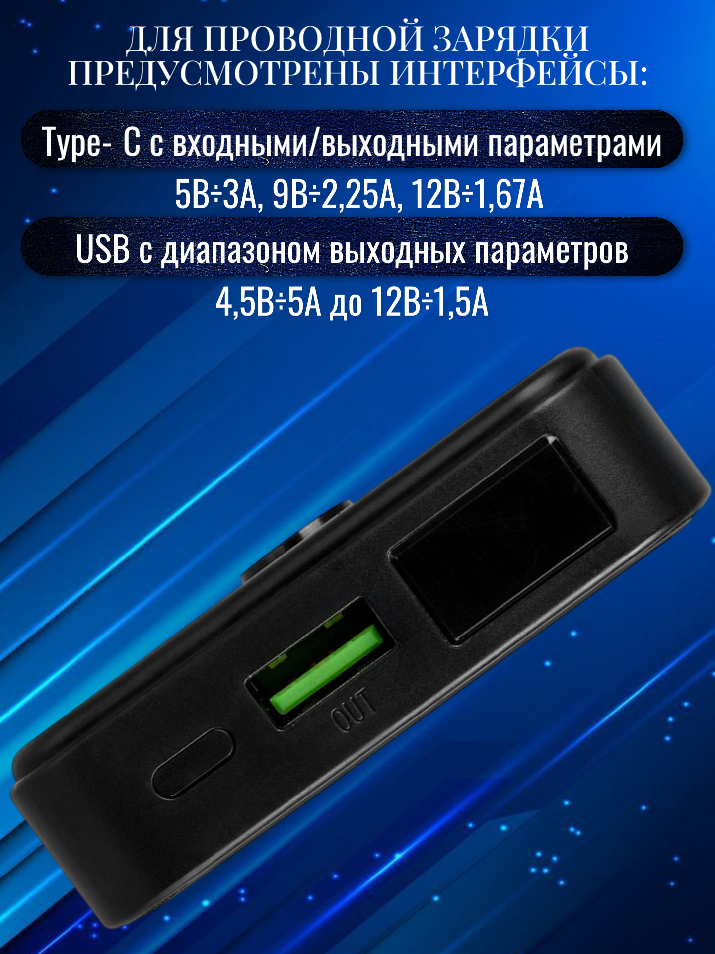 Ёмкость аккумулятора составляет 10000 ман, что позволяет многократно подзаряжать смартфон в течение дня. Беспроводная зарядка поддерживает мощность до 15 Вт, обеспечивая достаточно быструю подпитку устройства. Для проводной зарядки предусмотрены интерфейсы: Type‑C с входными/выходными параметрами 5В÷3А, 9В÷2,25А, 12В÷1,67А и USB с диапазоном выходных параметров от 4,5В÷5А до 12В÷1,5А.