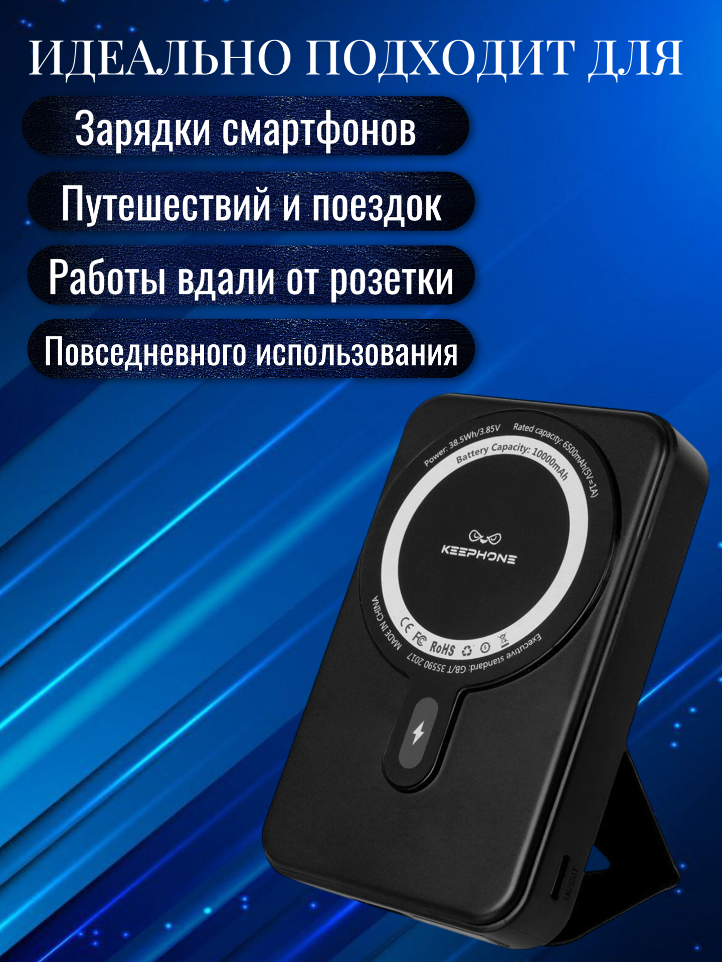 Внешний аккумулятор KEEPHONE SNAP STAND 10000 mAh в чёрном цвете — компактный и функциональный аксессуар для владельцев iPh, оснащённый технологией MagSafe. Устройство сочетает ёмкий аккумулятор с продуманным дизайном, обеспечивая удобство в повседневных сценариях использования.