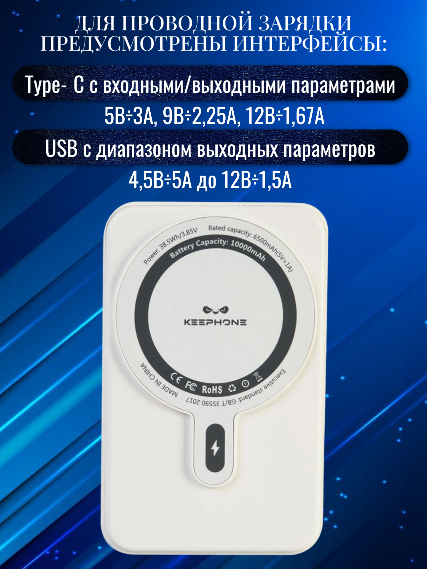Ёмкость аккумулятора составляет 10000 ман, что позволяет многократно подзаряжать смартфон в течение дня. Беспроводная зарядка поддерживает мощность до 15 Вт, обеспечивая достаточно быструю подпитку устройства. Для проводной зарядки предусмотрены интерфейсы: Type‑C с входными/выходными параметрами 5В÷3А, 9В÷2,25А, 12В÷1,67А и USB с диапазоном выходных параметров от 4,5В÷5А до 12В÷1,5А.