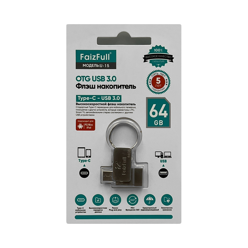 Универсальная флешка FaizFull U15 представляет собой современное решение для хранения и передачи данных с комбинированным интерфейсом USB Type-C и стандартным USB, что делает её совместимой как с мобильными устройствами, так и с компьютерами.