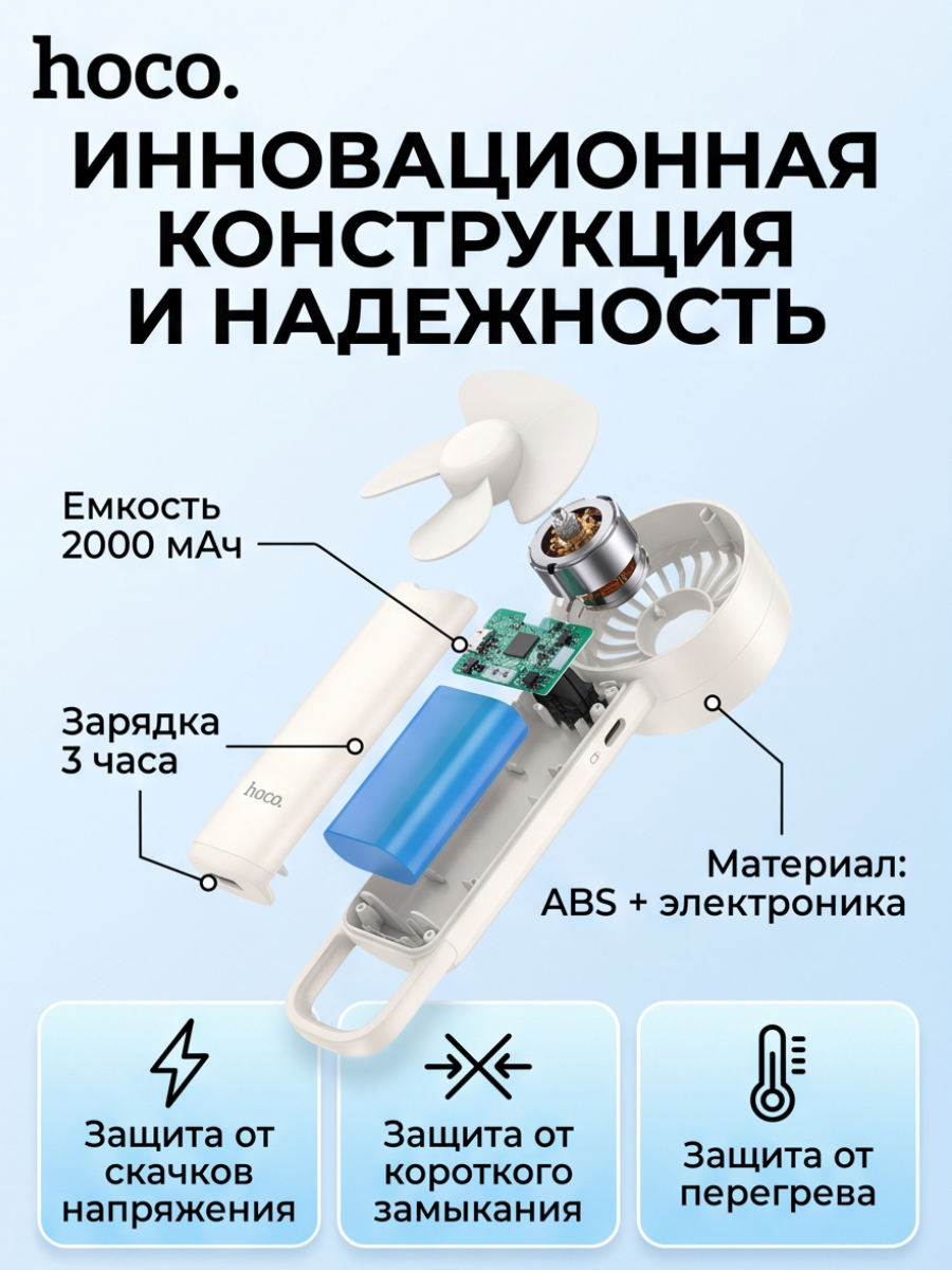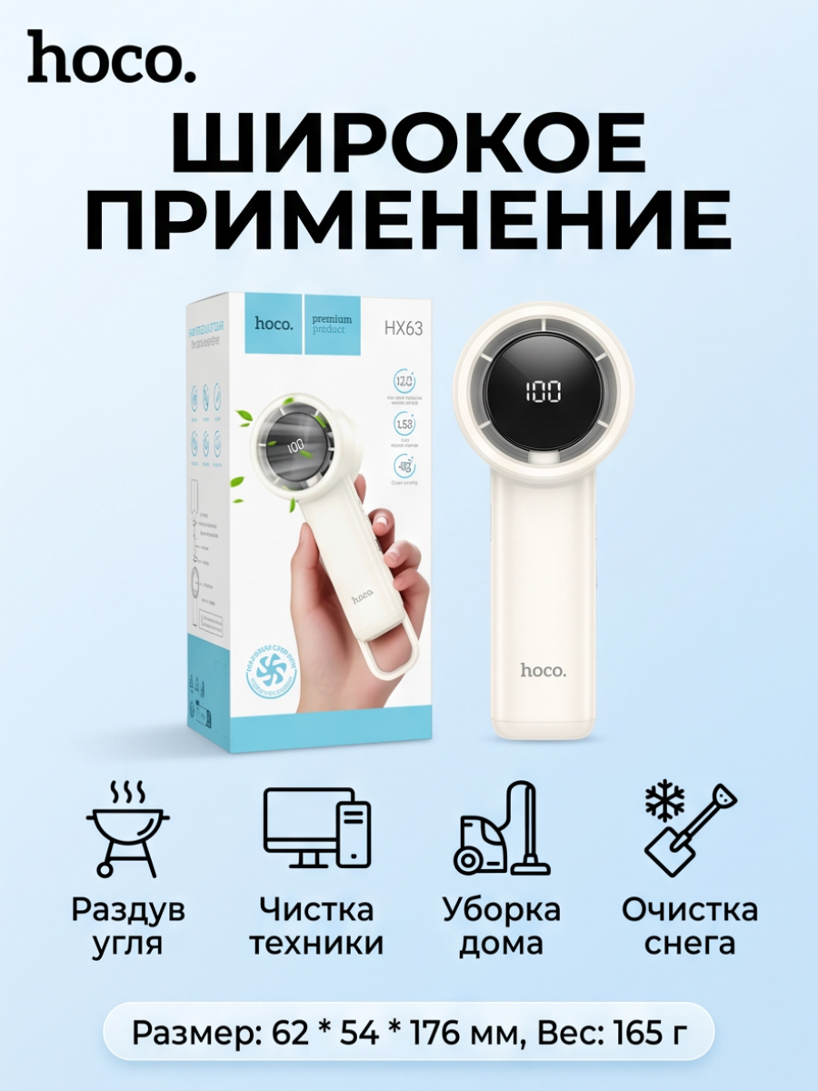 Портативный аккумуляторный вентилятор hoco HX63 — компактное и удобное решение для дома, офиса, поездок, прогулок и активного отдыха. Модель сочетает современный дизайн, легкий корпус и практичную функциональность, обеспечивая комфортный поток воздуха в жаркую погоду. Вентилятор можно использовать как настольный, так и ручной, а благодаря петле/креплению его удобно брать с собой в дорогу, на работу, учебу или прогулку.