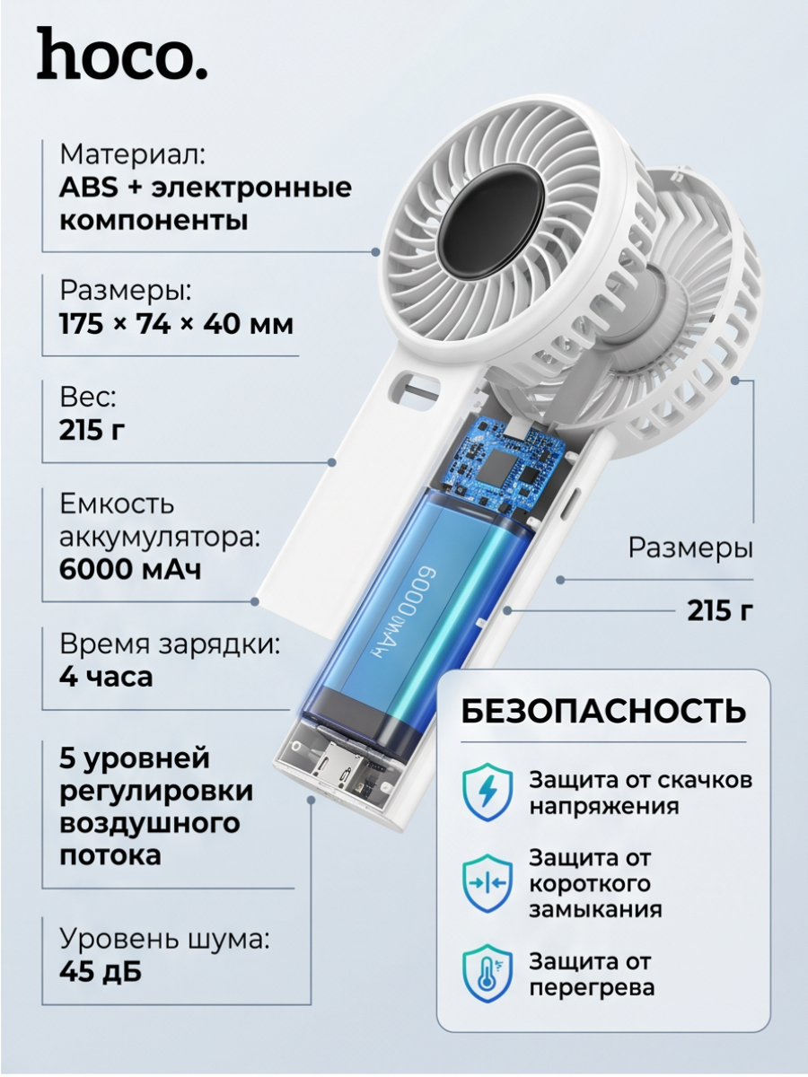Корпус выполнен из прочного ABS-пластика и электронных компонентов высокого качества, устойчив к повседневной эксплуатации и сохраняет аккуратный внешний вид. Компактные размеры 175 × 74 × 40 мм и вес 215 г обеспечивают мобильность и удобство хранения. Вентилятор подойдет для работы за компьютером, поездок в транспорте, путешествий, отдыха на природе, тренировок, ожидания в очередях, а также в качестве полезного подарка.