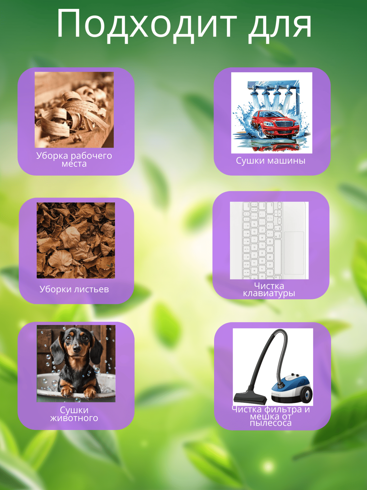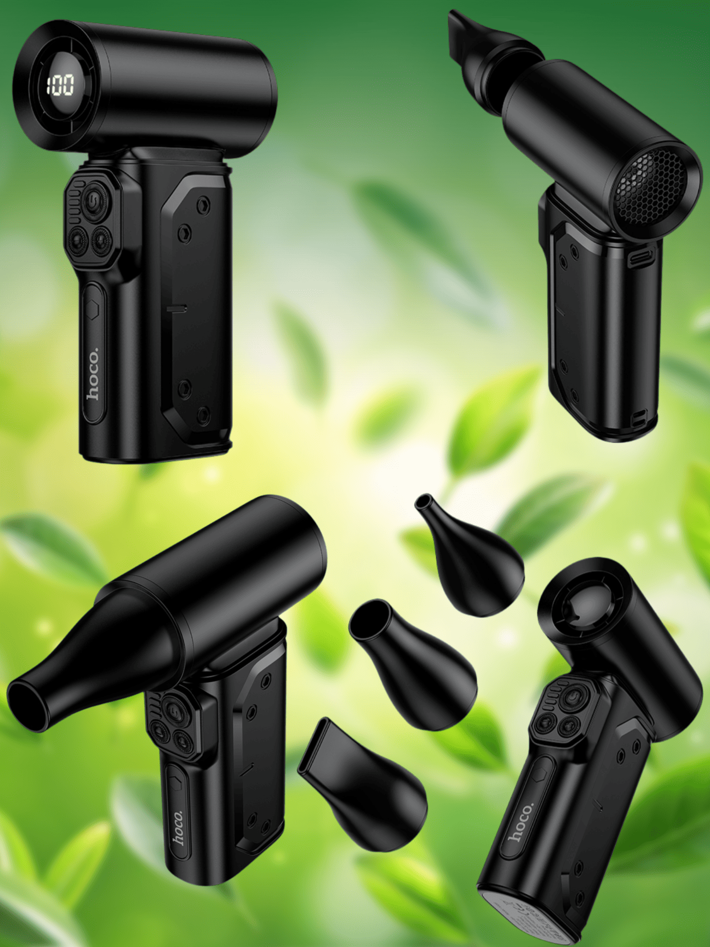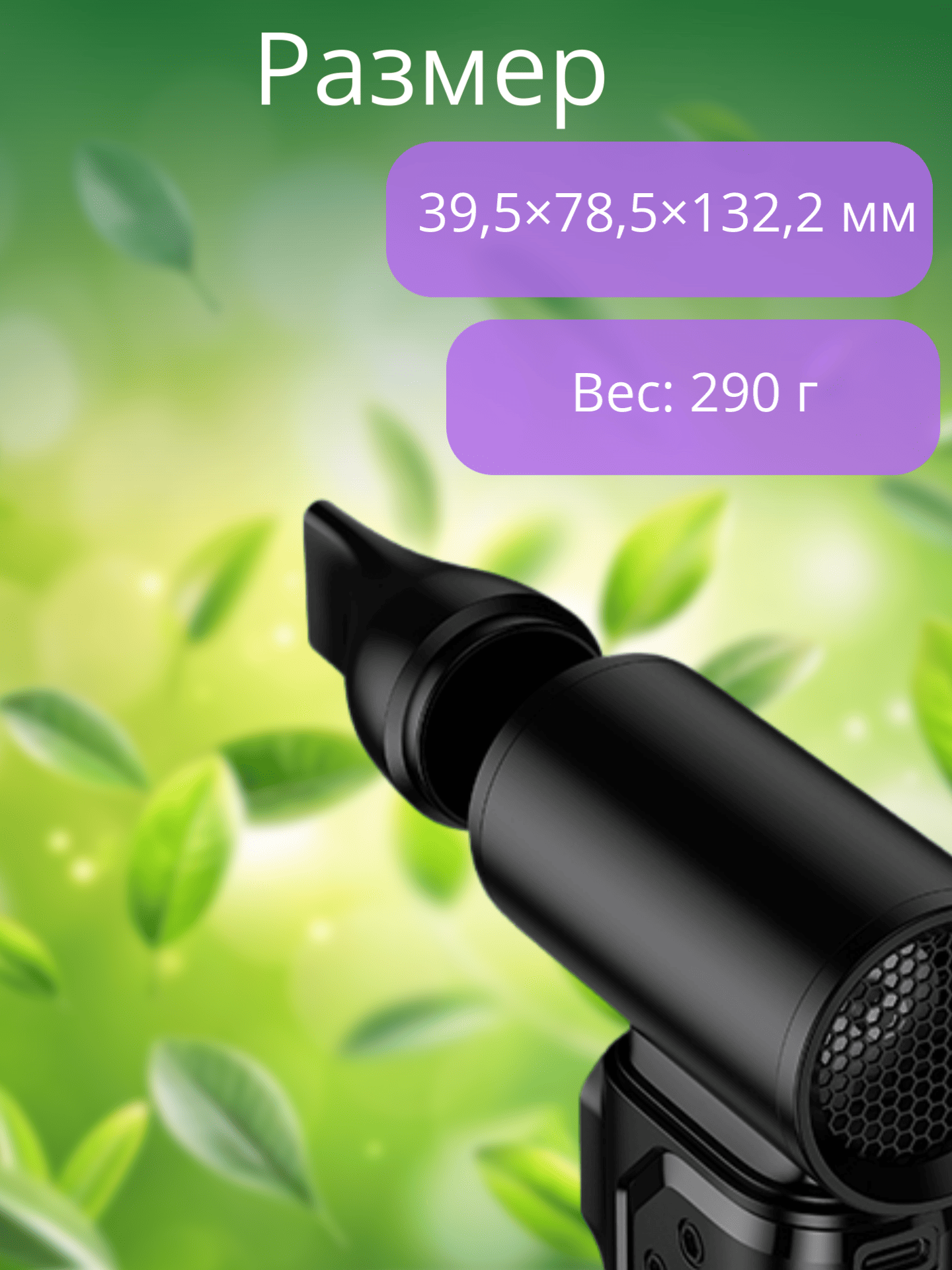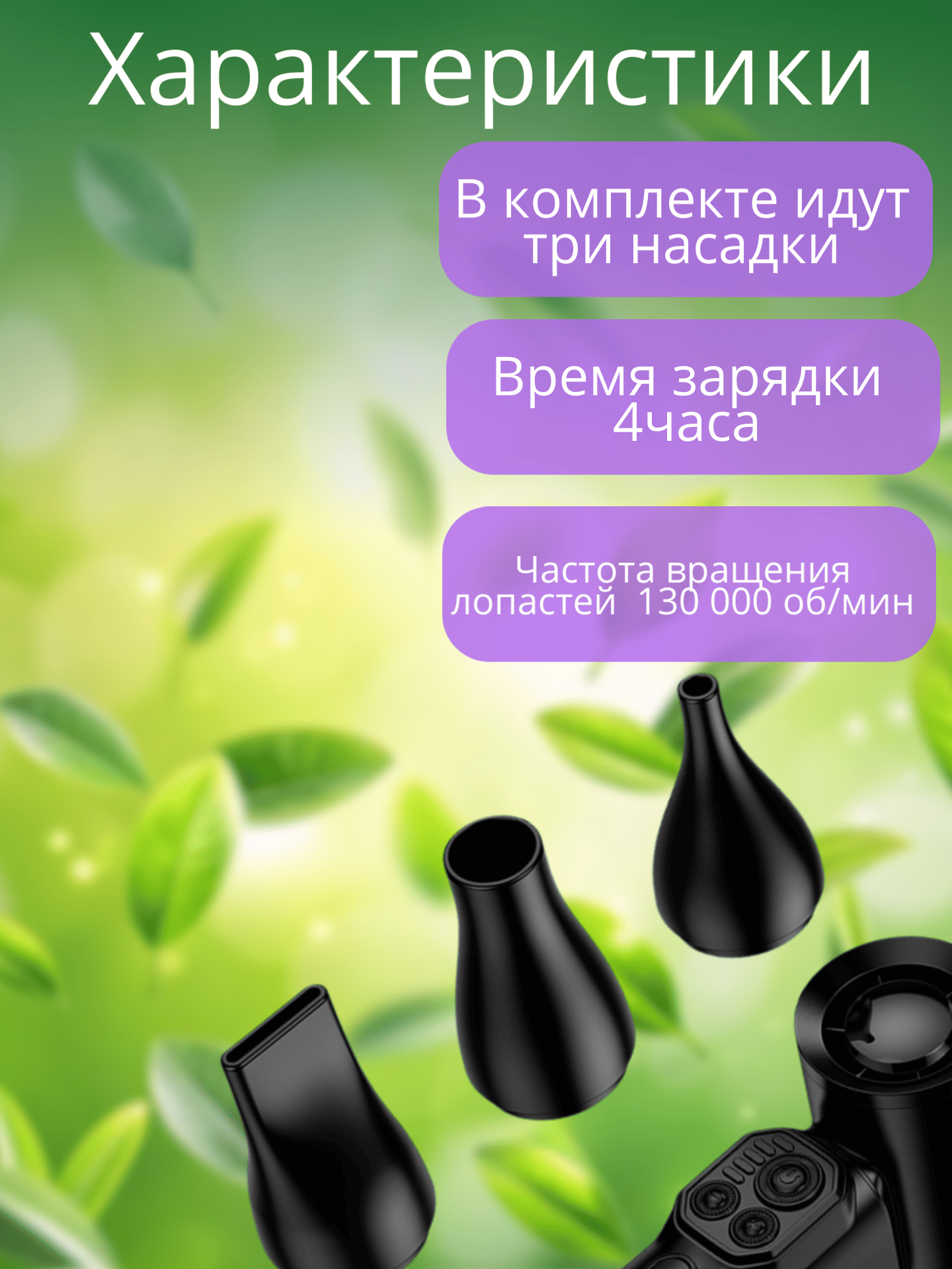 В комплекте идут три сменные насадки‑насадки, которые позволяют регулировать направление и интенсивность воздушного потока:
