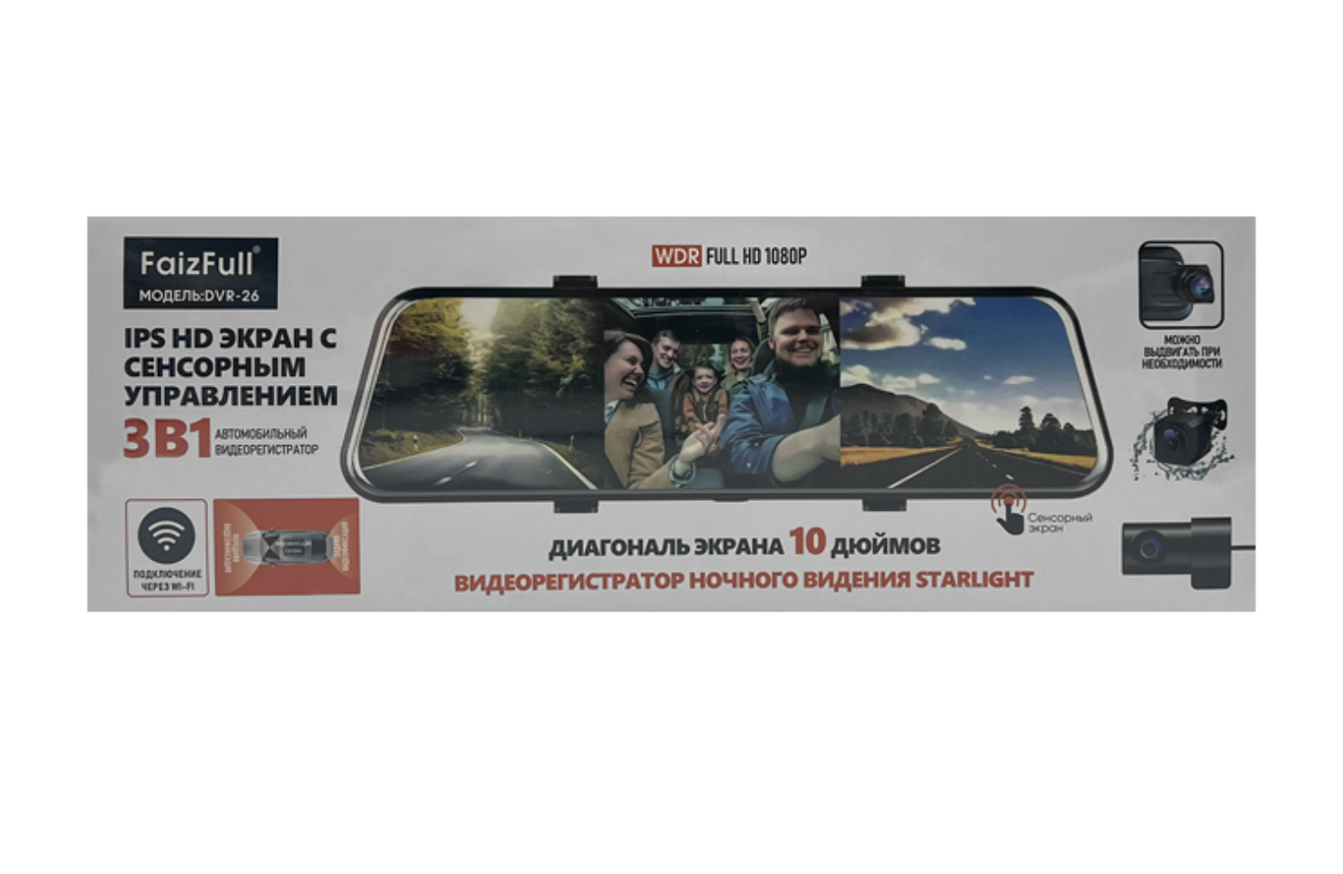 Инновационный автомобильный видеорегистратор-зеркало FaizFull DVR-26 представляет собой современное устройство с тремя камерами и впечатляющим 10-дюймовым сенсорным экраном.