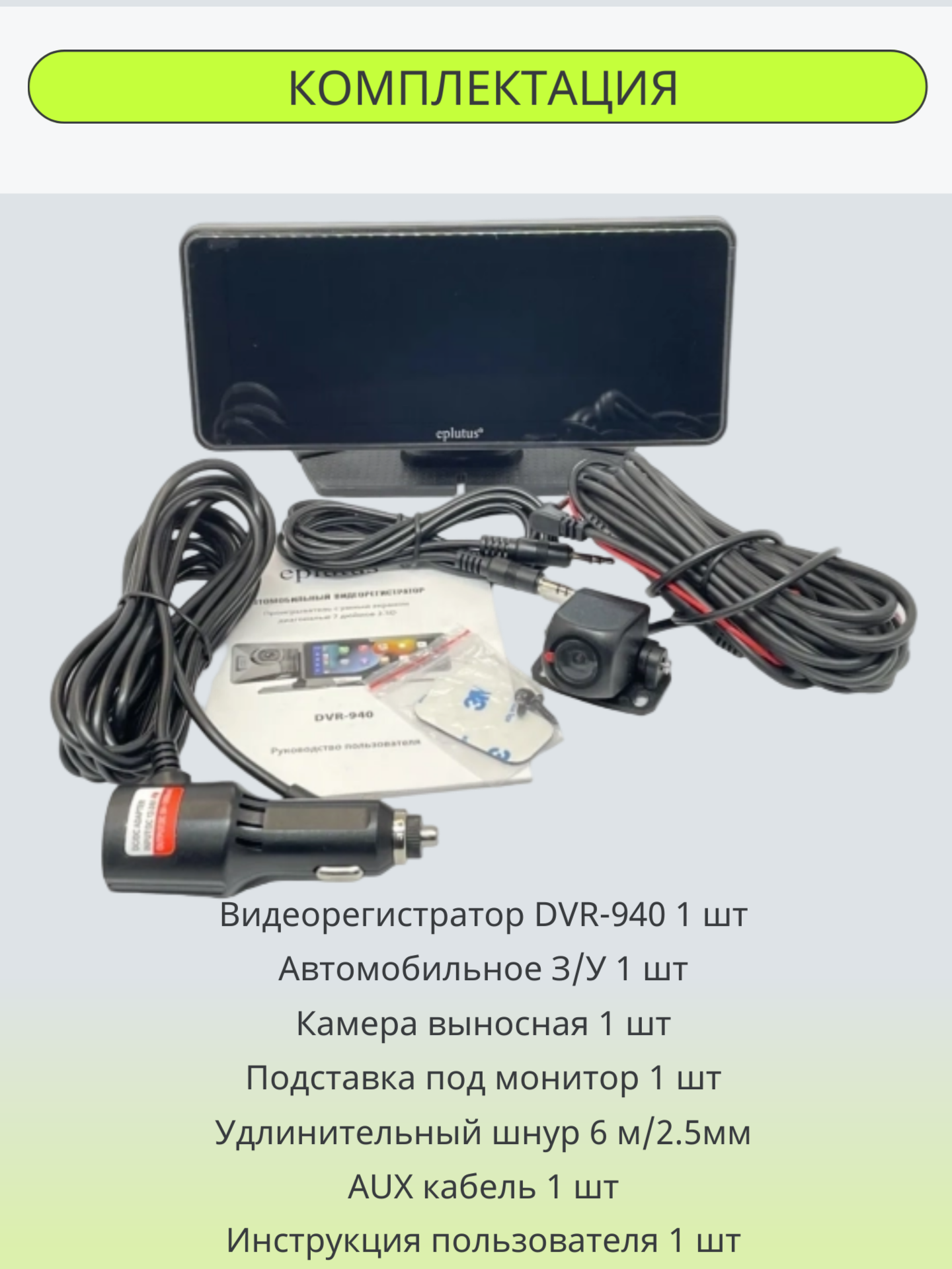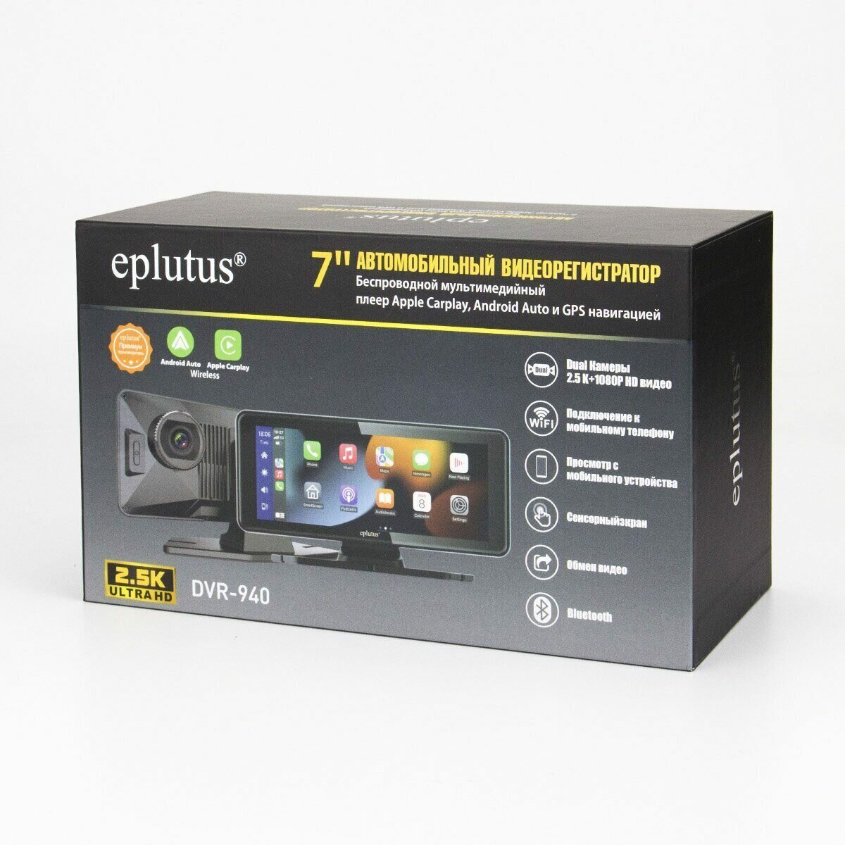 Видеорегистратор Eplutus DVR-940 WiFi — это современное устройство для записи видео с высоким качеством изображения и детализацией. Он оснащён двумя камерами: основной с разрешением 2560x1440 и дополнительной с разрешением 1920x1080.