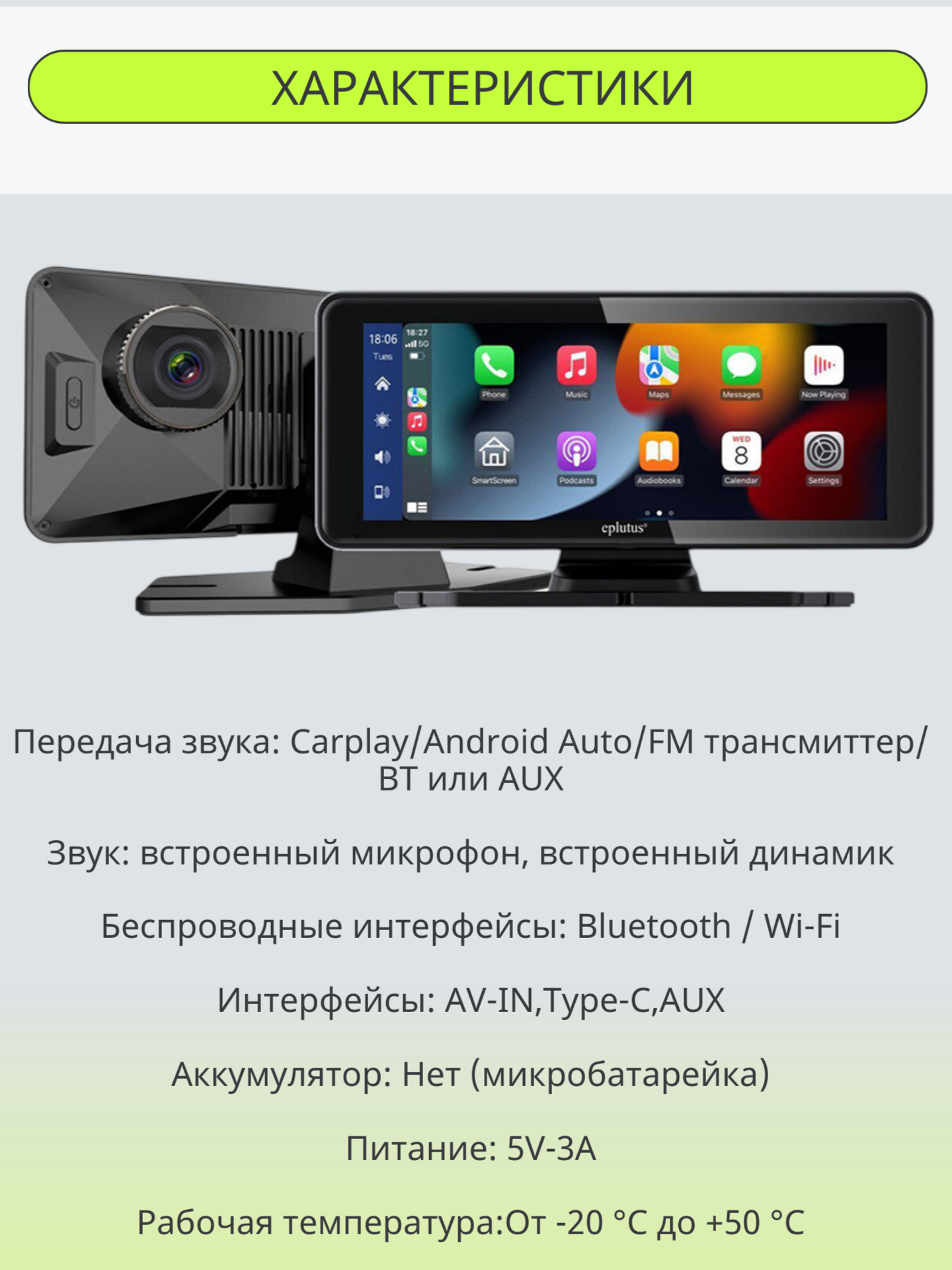 Передача звука: Carplay/Android Auto/FM трансмиттер/ВТ или AUX