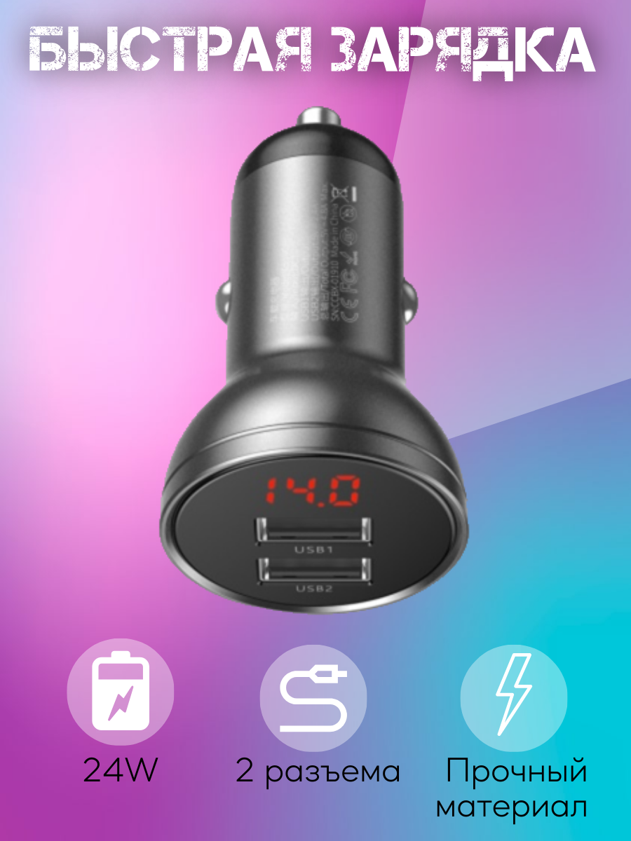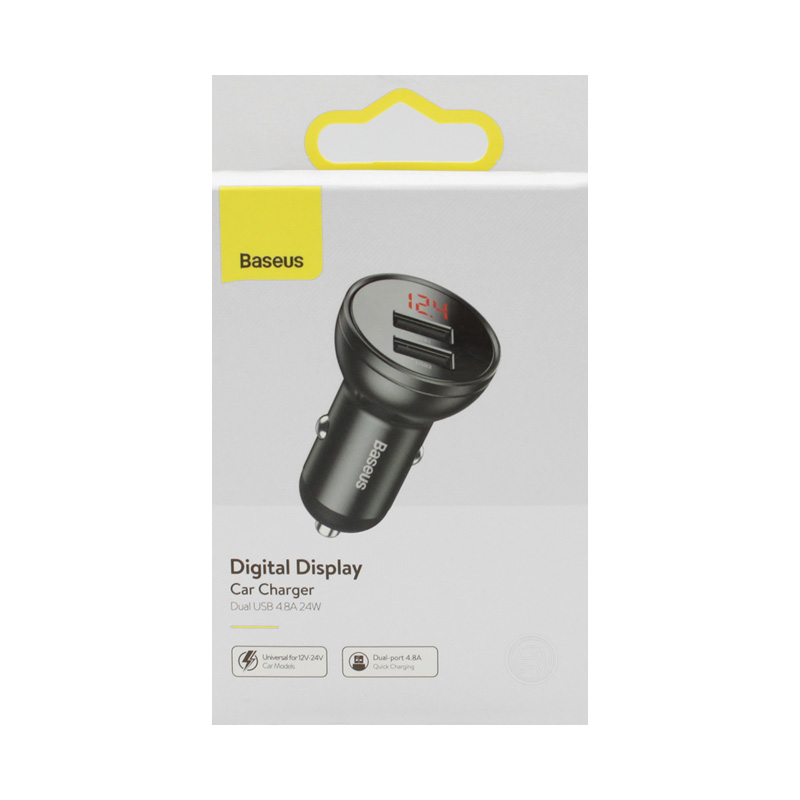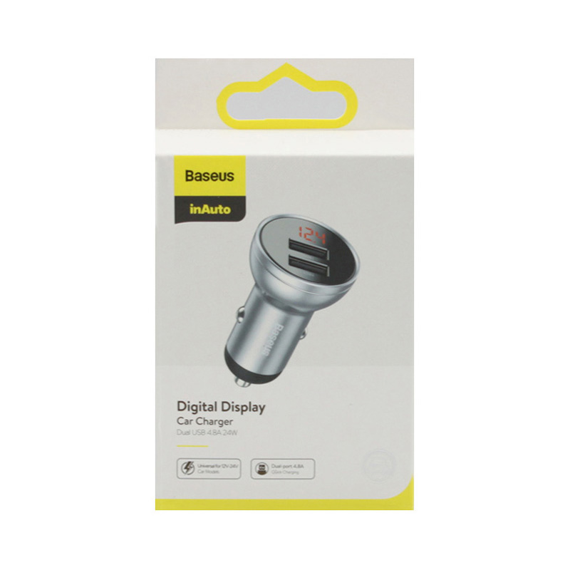 Baseus Digital Display Dual USB 4.8A Car Charger 24W – автомобильное зарядное устройство, которое позволяет зарядить смартфон в машине. Вставляется в прикуриватель. Устройство совместимо со всеми известными торговыми марками смартфонов.