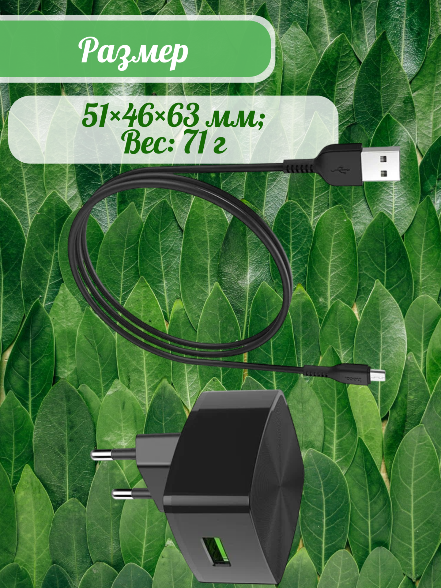 Практичность применения подчеркивается компактными размерами (51×46×63 мм) и небольшим весом (71 г). В комплект входит качественный кабель длиной 1 метр с разъемом micro USB.