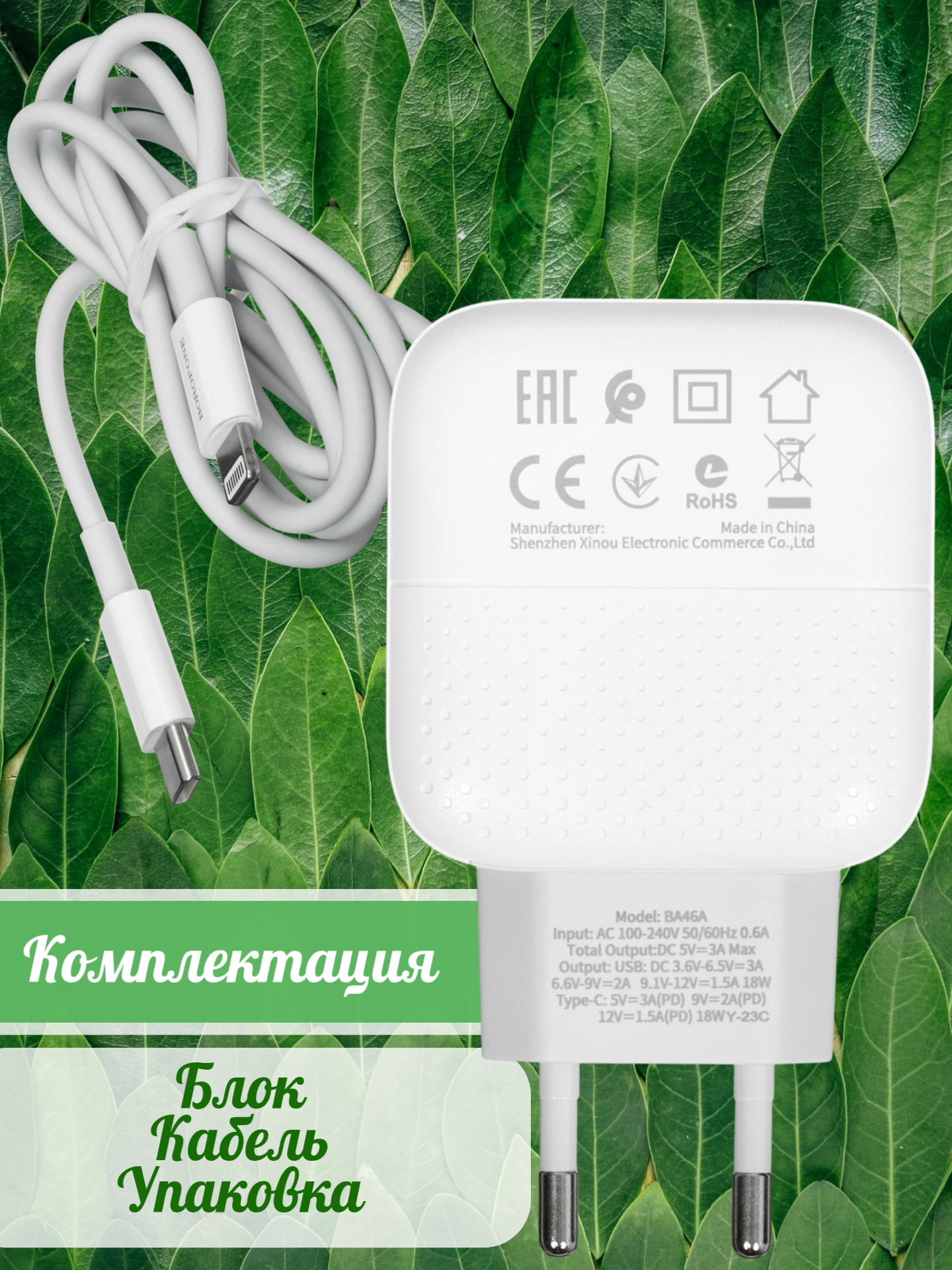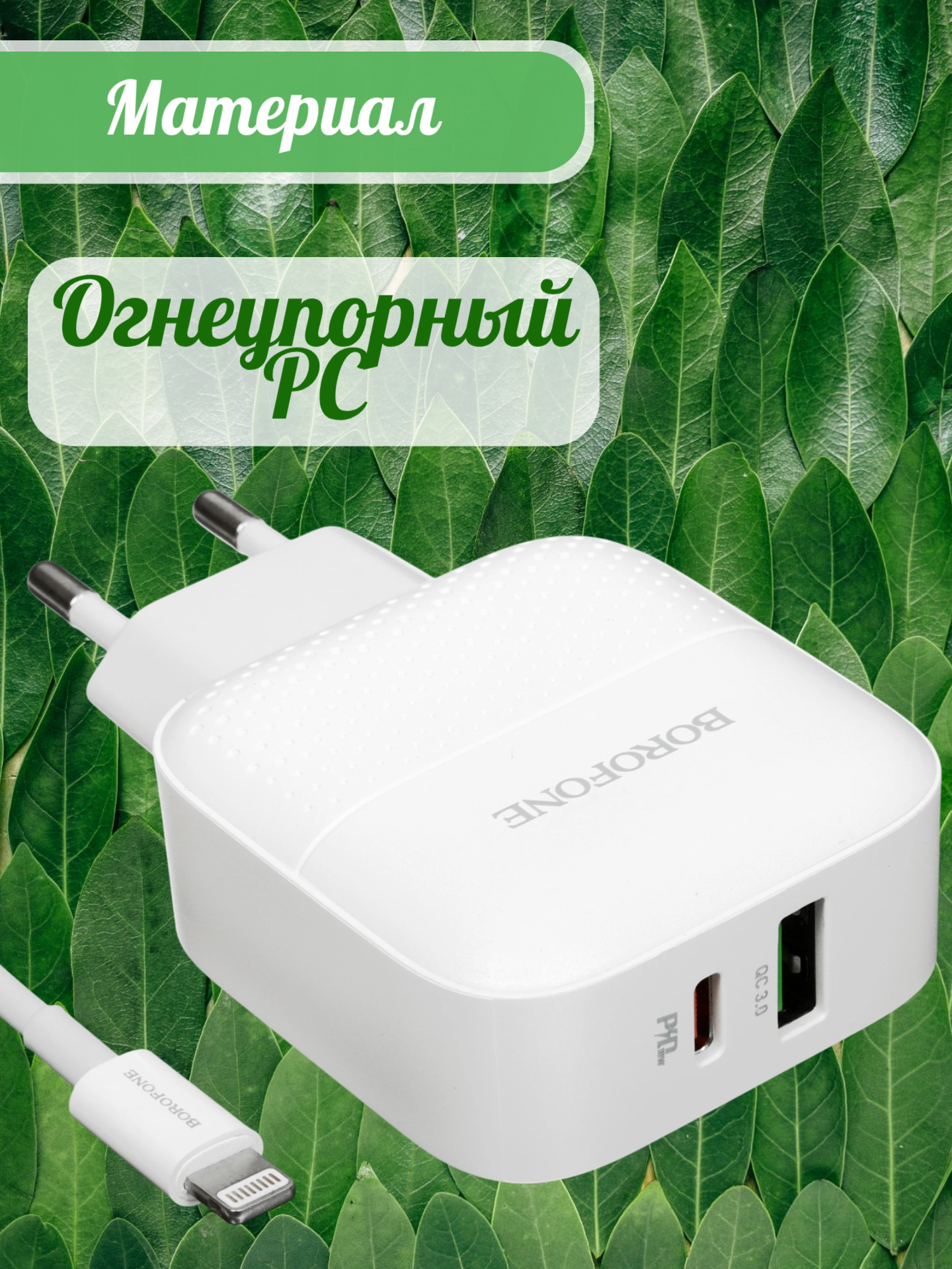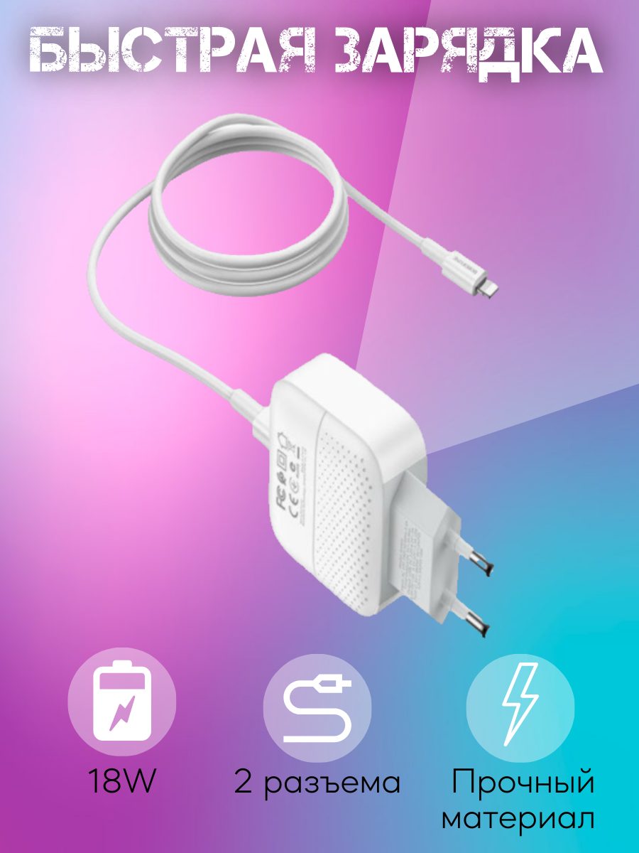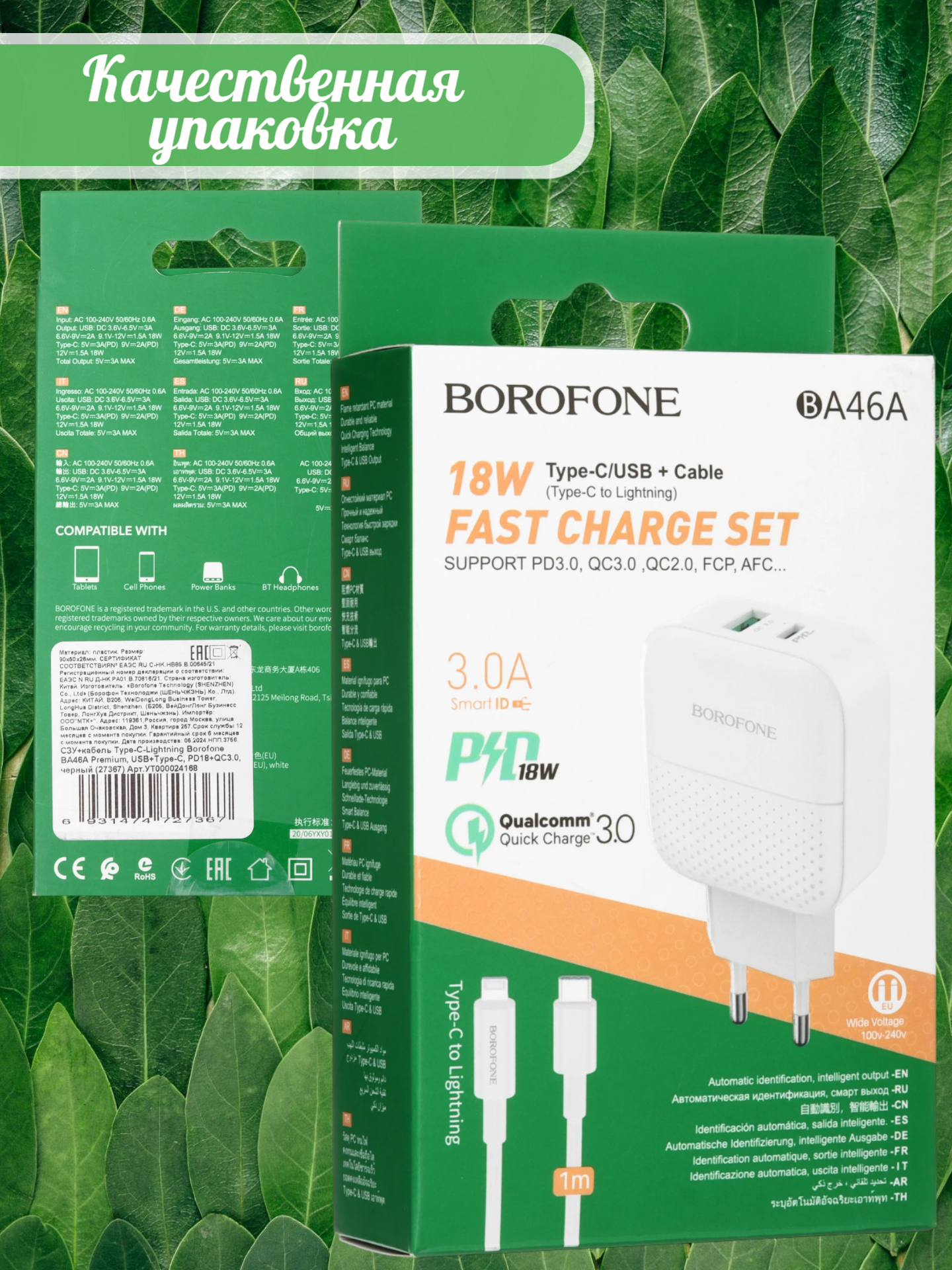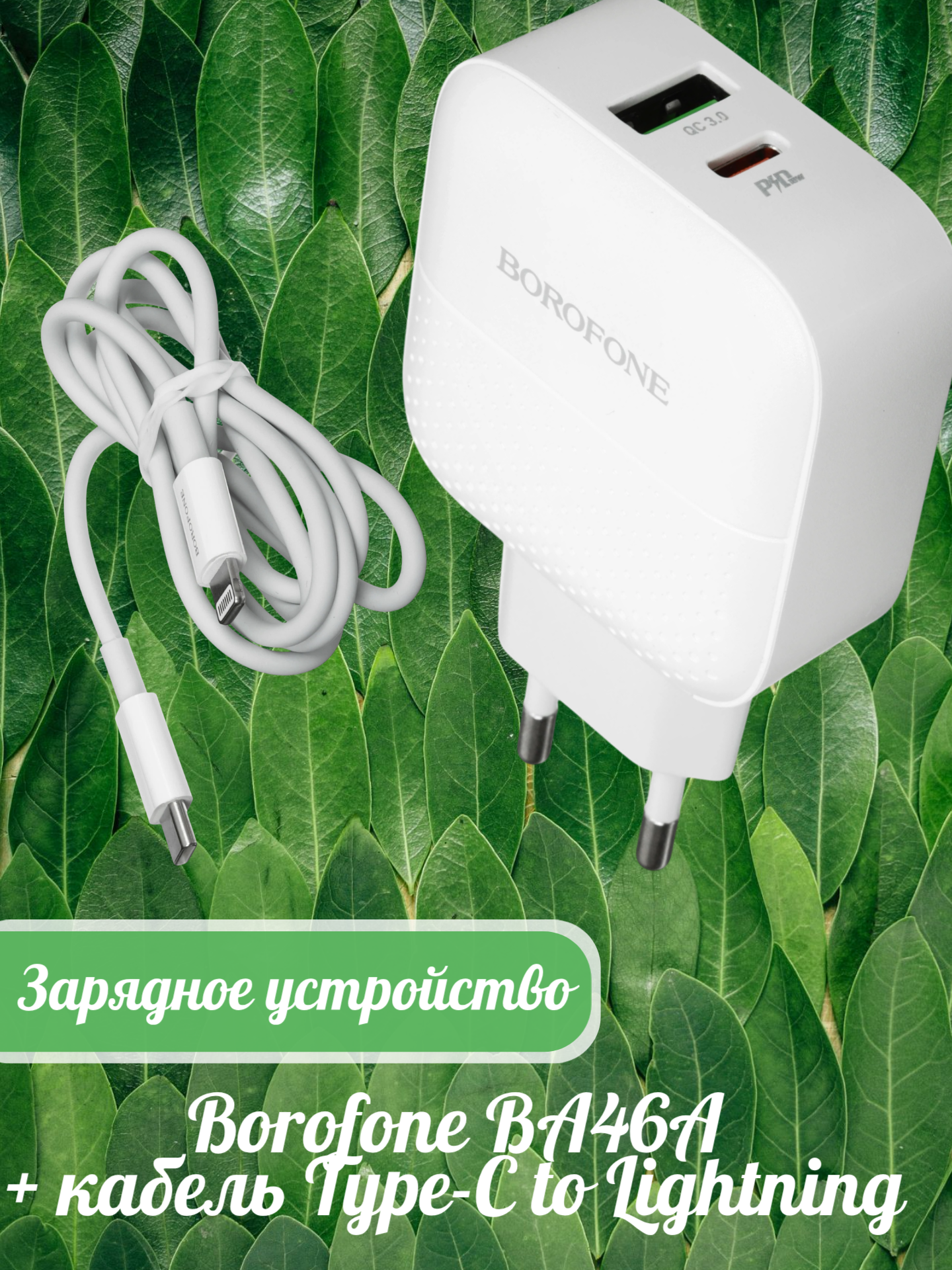 BOROFONE BA46A Premium, PD + QC3.0 сетевое зарядное устройство с выходами USB-A и USB-C, вилка EU, ток 3A, набор с кабелем USB-C на Lightning.