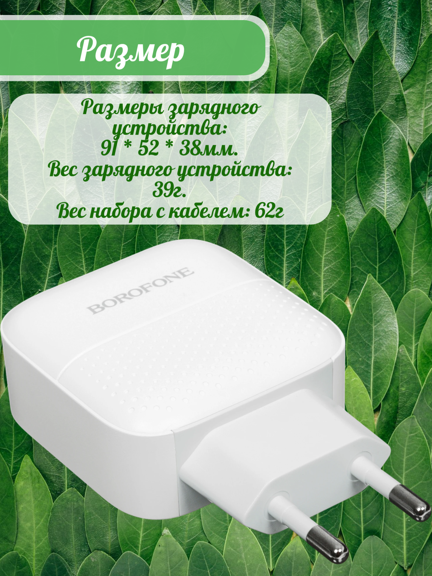 7. Размеры зарядного устройства: 91 * 52 * 38мм. Вес зарядного устройства: 39г. Вес набора с кабелем: 62г.