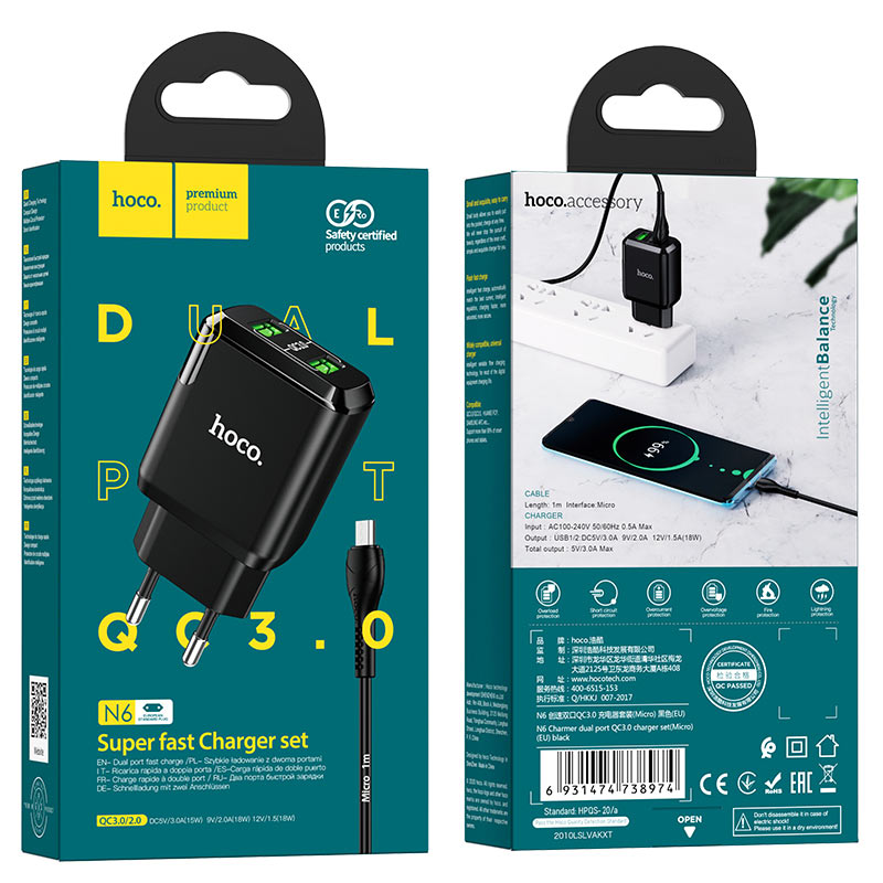 CСЗУ N6 Charmer - зарядное устройство, два USB, 3A выход, EU штекер, набор с кабелем Micro-USB, поддержка для QC3.0/QC2.0, FCP, AFC.