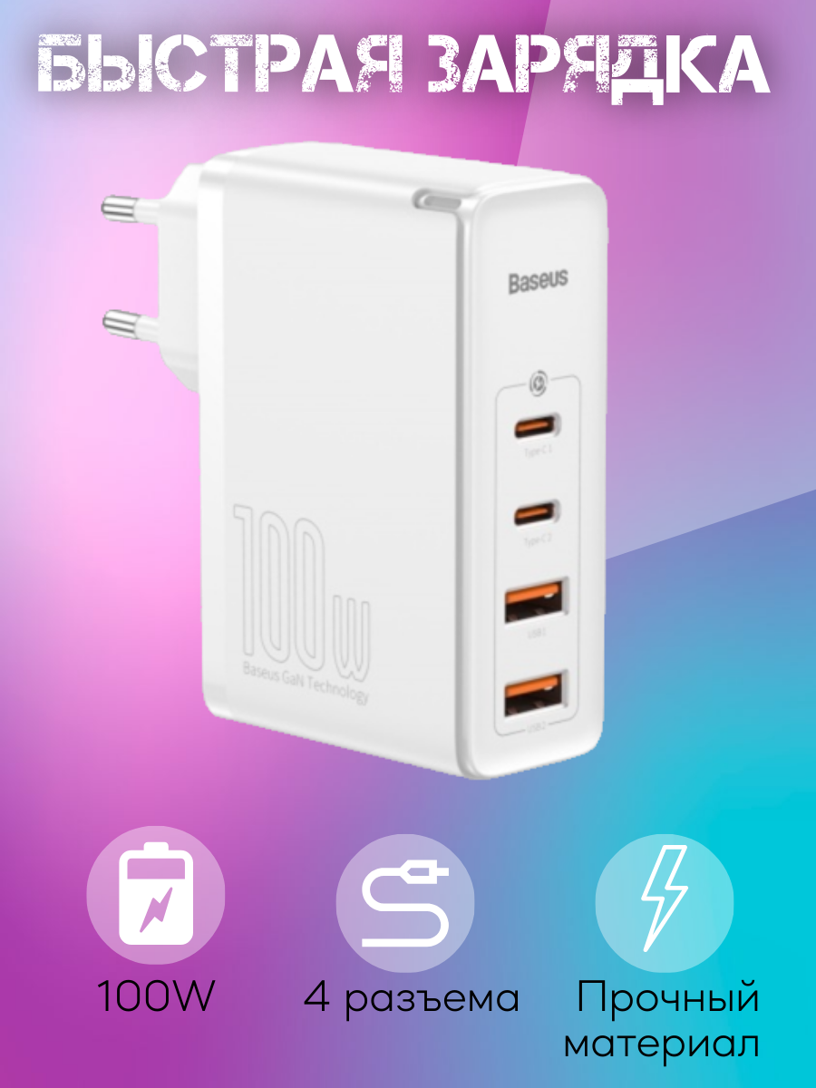 Сетевой адаптер Baseus (CCGAN2P-L02) с возможностью одновременно заряжать до четырёх гаджетов при общей мощности 100 Вт. Поддерживает множество протоколов быстрой зарядки, имеет защиту от перезарядки, статического напряжения и короткого замыкания.