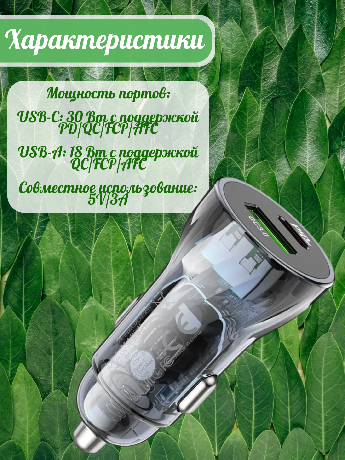 USB-C: 30 Вт с поддержкой PD/QC/FCP/AFC