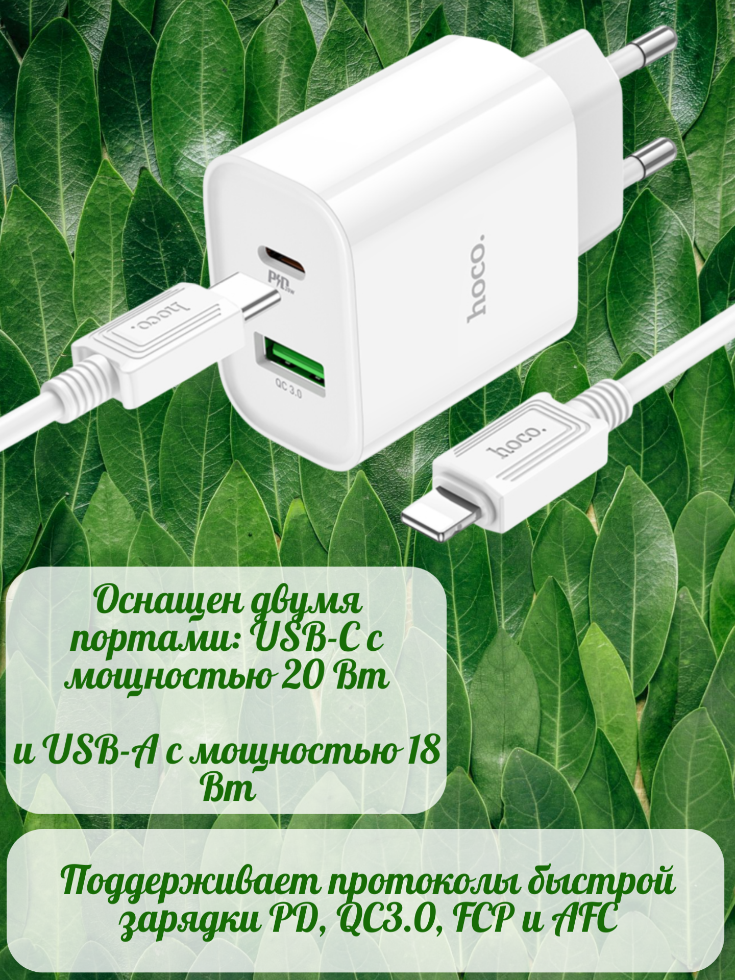 Зарядное устройство Hoco C80A Plus PD20W+QC3.0 с кабелем Lightning — это компактное и мощное устройство для быстрой зарядки ваших гаджетов. Оно оснащено двумя портами: USB-C с мощностью 20 Вт и USB-A с мощностью 18 Вт, что позволяет заряжать два устройства одновременно. Поддерживает протоколы быстрой зарядки PD, QC3.0, FCP и AFC, обеспечивая быструю и безопасную зарядку.