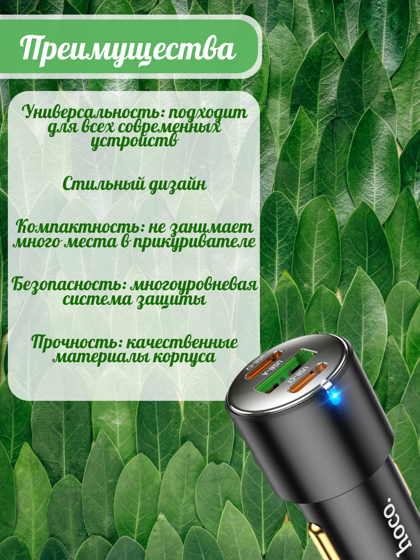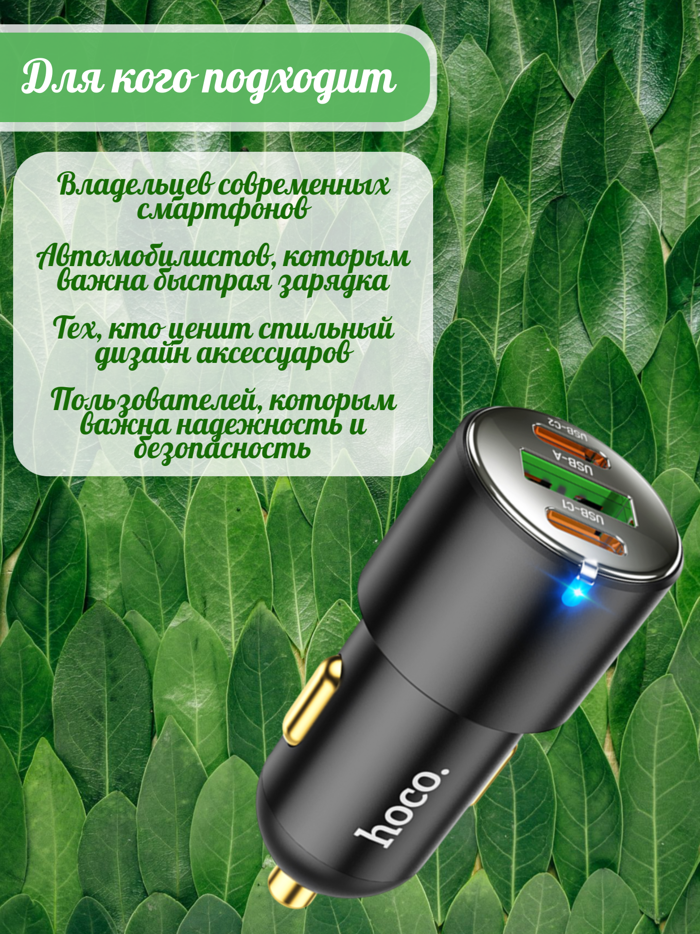 Hoco NZ6 оптимизирован для работы с устройствами что делает его универсальным решением для быстрой зарядки различных гаджетов в дороге. Устройство станет незаменимым помощником для тех, кто часто путешествует на автомобиле и нуждается в быстрой подзарядке своих устройств.
