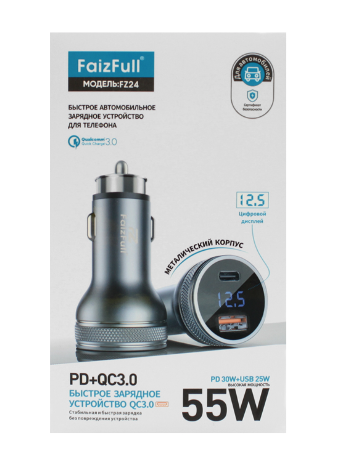 FaizFull FZ24 поставляется в фирменной упаковке, что гарантирует сохранность устройства при транспортировке и хранении. Это надёжное решение для тех, кто ценит комфорт и безопасность зарядки в дороге.