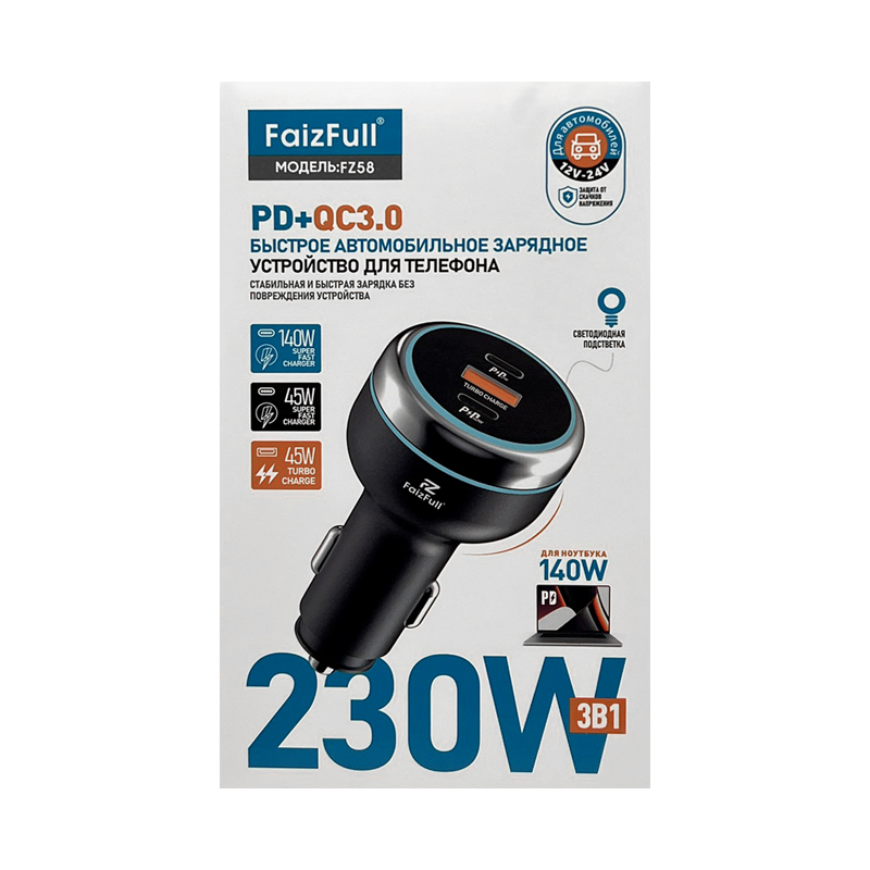 Зарядное устройство FaizFull FZ42 — это автомобильное зарядное устройство с двумя портами USB и Type-C, которое поддерживает быструю зарядку QC3.0 и PD3.0.