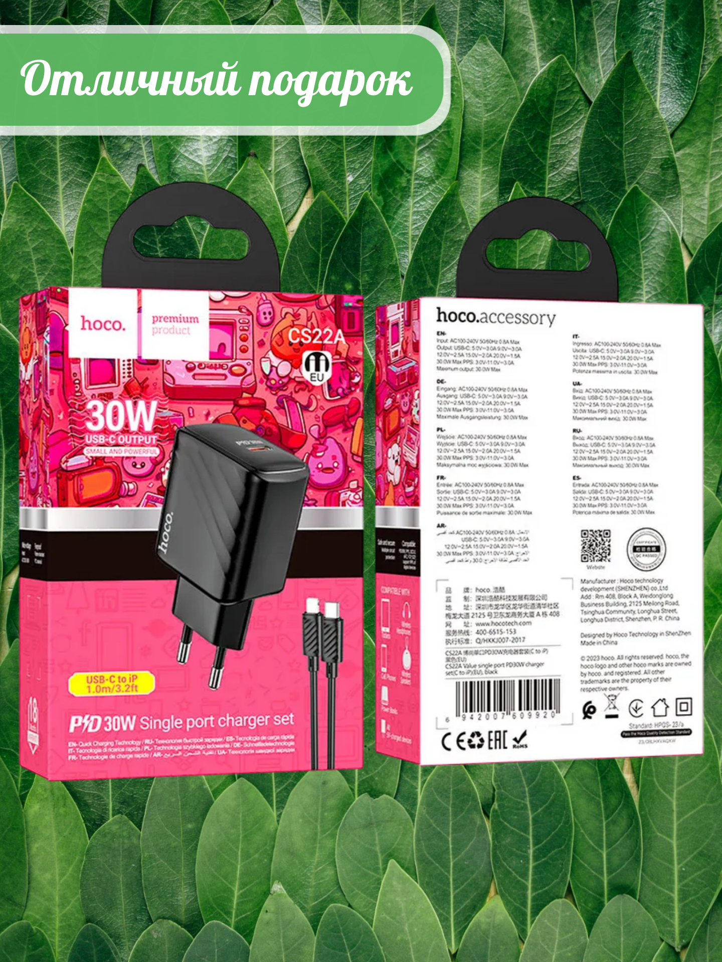CS22A Value, зарядное устройство с одним Type-C 30W выходом, EU штекер, набор с кабелем 1м Type-C на Lightning или Type-C на Type-C