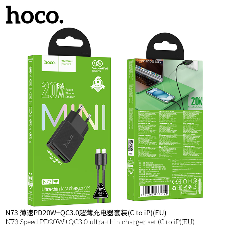 Hoco N73 — это современное сетевое зарядное устройство с двумя портами для одновременной зарядки двух устройств.