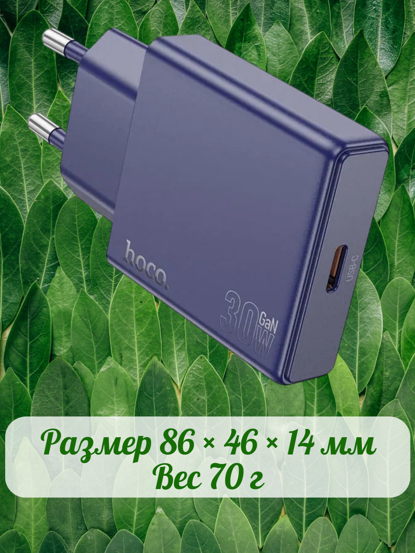 Устройство оснащено европейской вилкой (тип EU) и адаптировано для работы в сетях с напряжением 100–220 В, что делает его пригодным для использования в большинстве стран. Компактные размеры (86 × 46 × 14 мм) и небольшой вес (70 г) обеспечивают удобство переноски — зарядное легко помещается в карман или сумку.