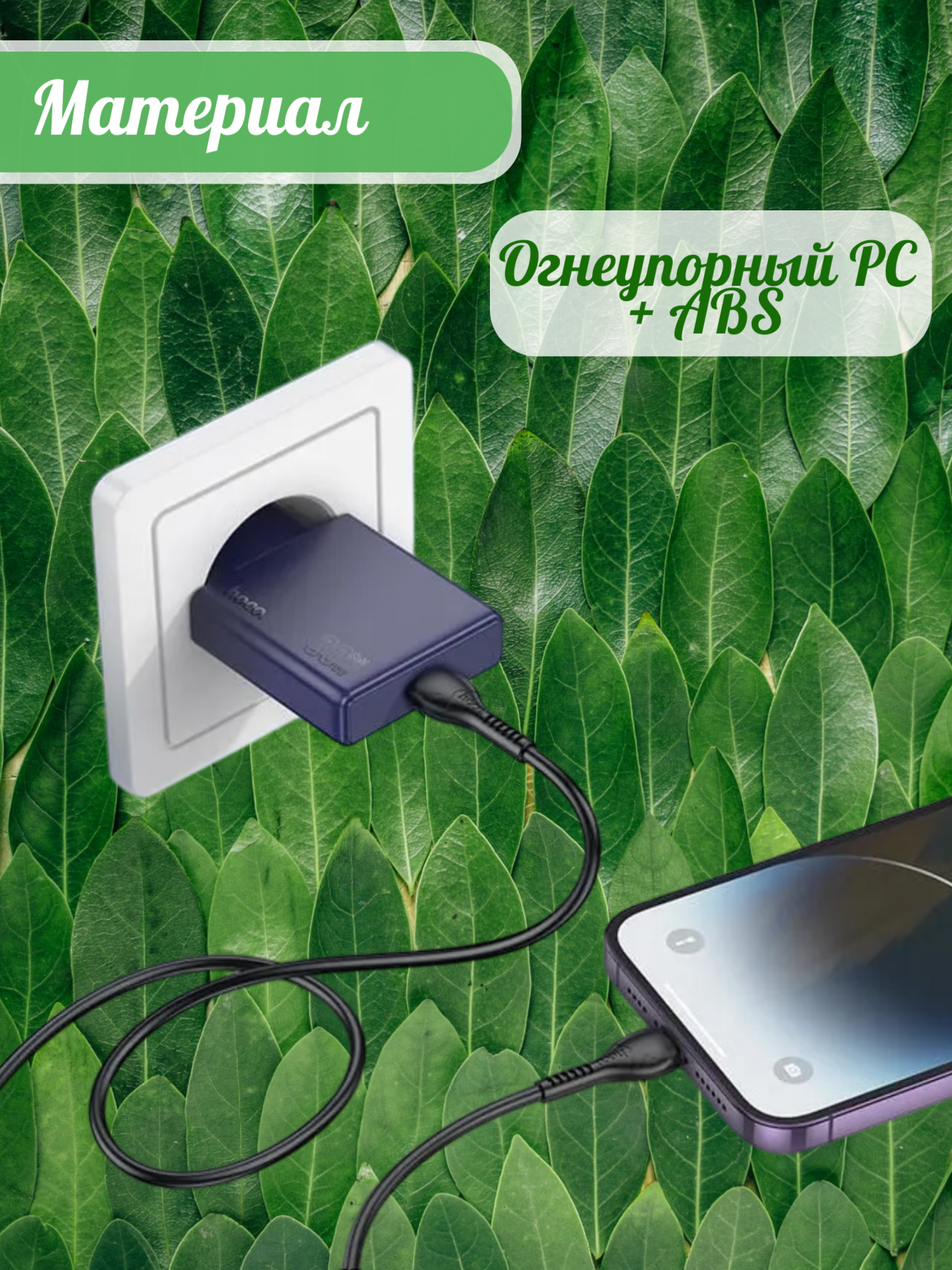 Корпус изготовлен из огнестойкого поликарбоната (PC), что обеспечивает безопасность при нагреве и длительный срок службы устройства. Модель оснащена двумя выходными портами: USB‑C и USB‑A, что позволяет одновременно заряжать два устройства.