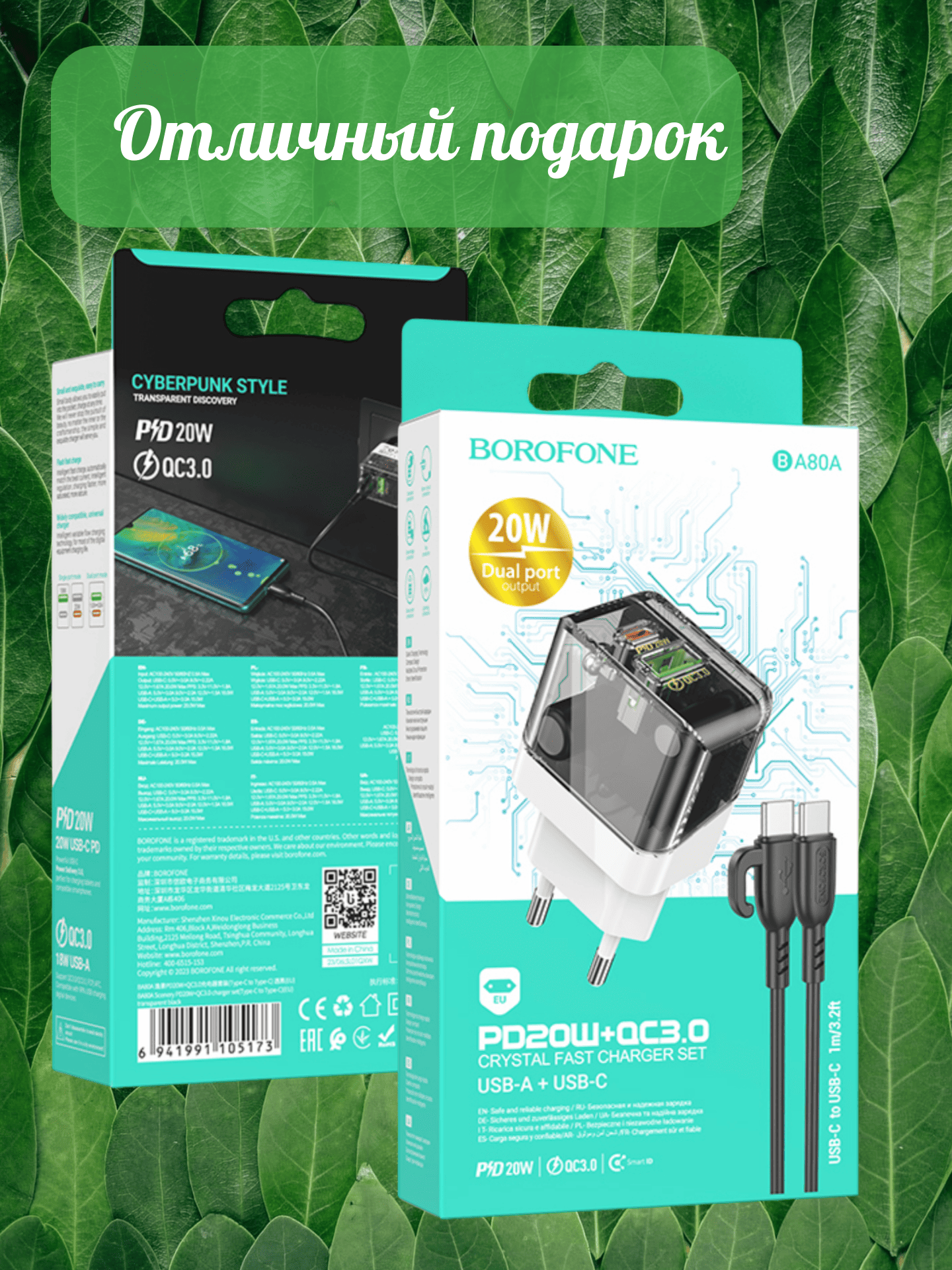 Зарядник Borofone BA80A PD20W в чёрном цвете — компактное и мощное решение для быстрой зарядки современных гаджетов. Устройство оснащено разъёмом Type‑C и поддерживает стандарт Power Delivery (PD) мощностью до 20 Вт, что позволяет оперативно восполнять заряд смартфонов, планшетов и других устройств, совместимых с технологией быстрой зарядки.