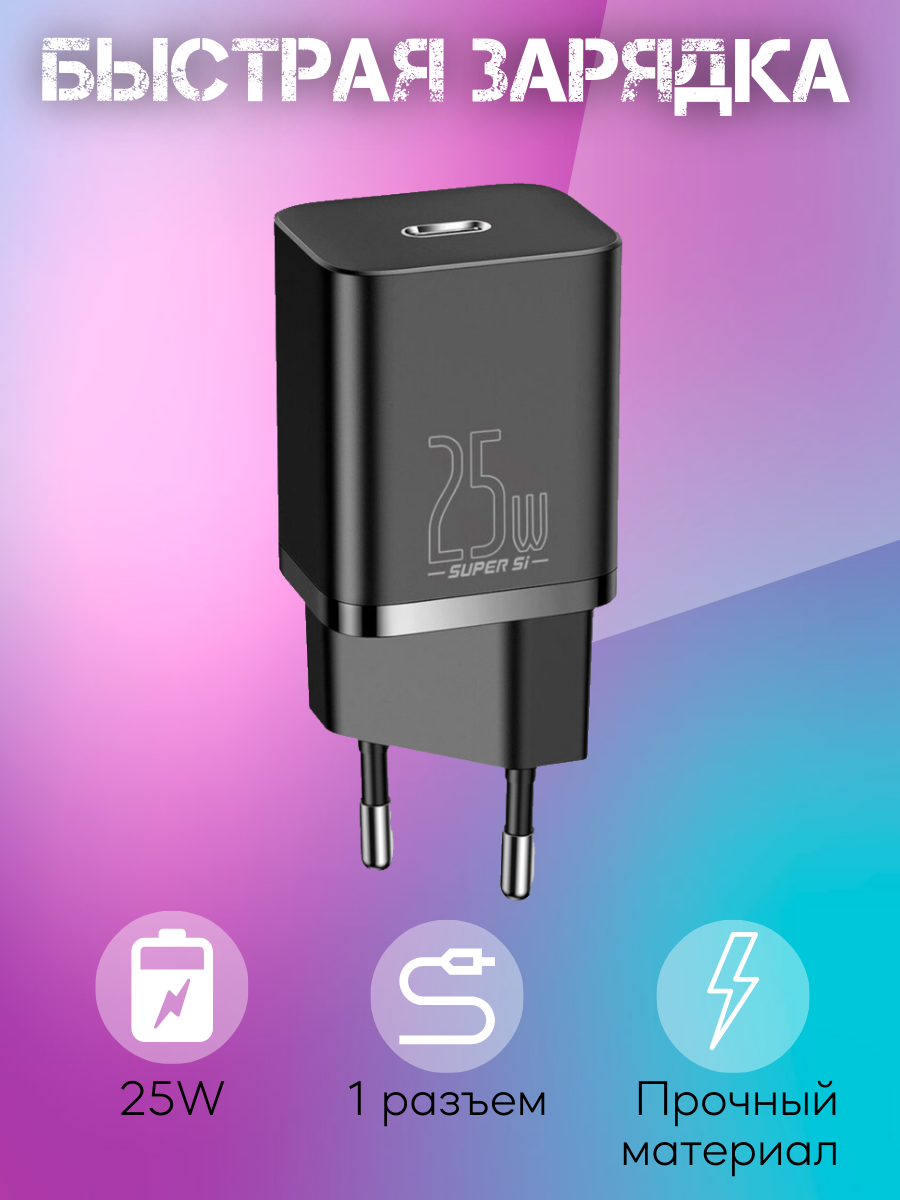 Baseus Super Si Quick Charger 1C 25W – компактное сетевое зарядное устройство, поддерживающее быструю зарядку по протоколам Quick Charge 3.0, Power Delivery 3.0 и другим. Оно оснащено одним выходным разъемом USB Type-C и поддерживает мощность 25 Вт.