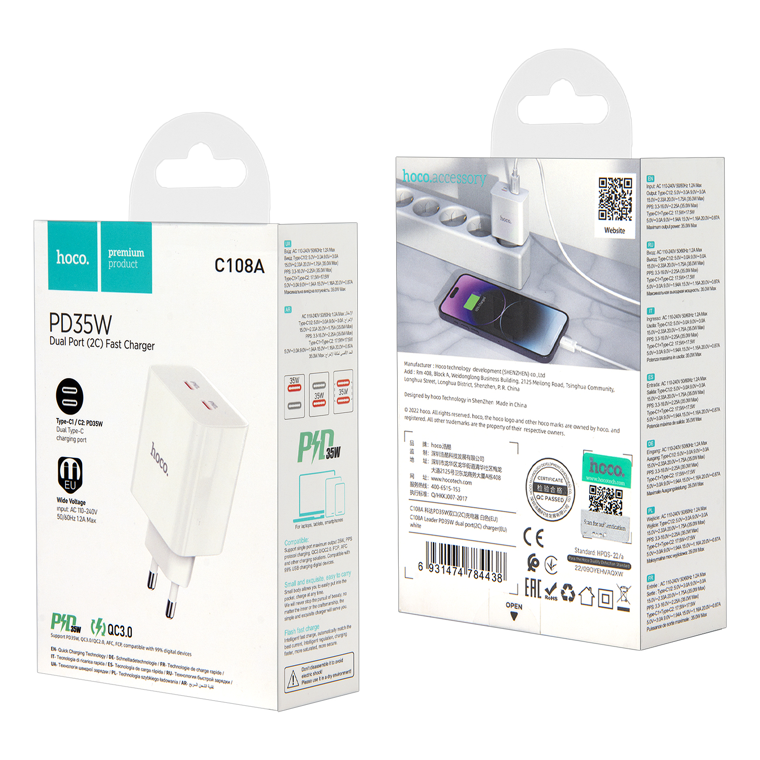Зарядное устройство Hoco с быстрой зарядкой Quick Charge 3.0, что позволяет заряжать устройства более быстро и безопасно.