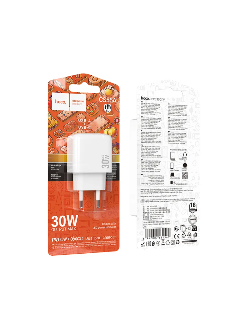 Сетевое зарядное устройство HOCO CS55A надежный и компактный помощник для вашего смартфона, обеспечивающий скоростную и стабильную зарядку.